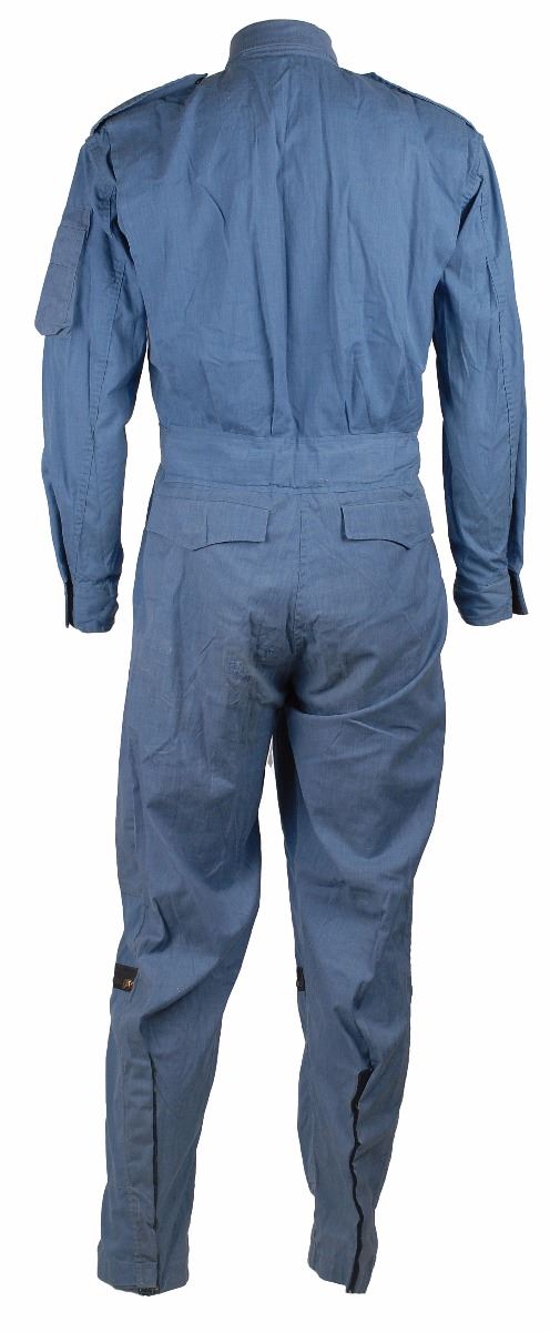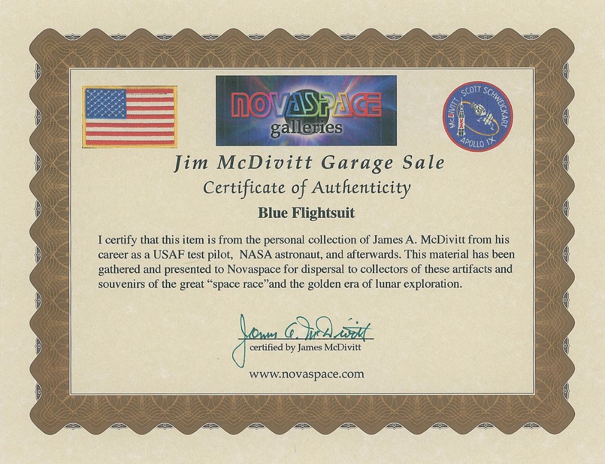 Jim McDivitt’s blue cotton United States Air Force test pilot flight suit with an official ‘meatball’ patch on the left breast. The Lou Foster manufacturer’s tag is sewn into the collar area. The suit exhibits typical wear from use. Accompanied by a certificate of authenticity from the Novaspace ‘Jim McDivitt Garage Sale,’ signed at the bottom in green ink, “James A. McDivitt.” The Leon Ford Collection.
