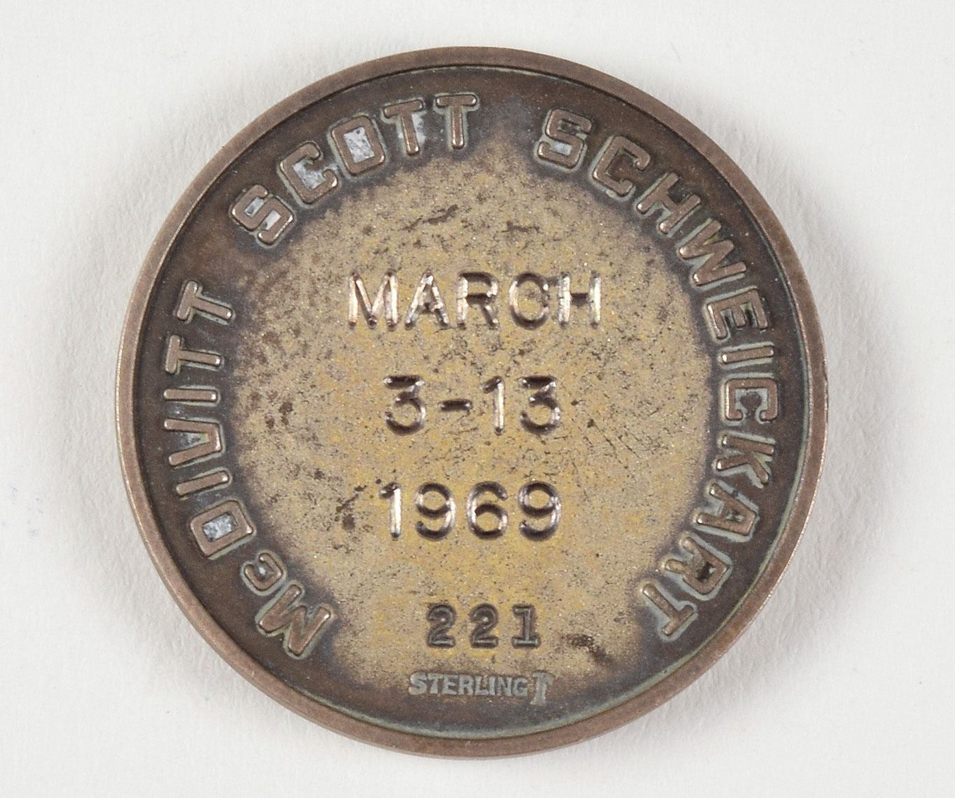 Jim McDivitt's flown sterling silver Apollo 9 Robbins medal, approximately 1? in diameter, with a raised design of the mission insignia on the face, and the reverse engraved with the mission dates, "March 3–13, 1969," and encircled by the names of the astronauts in raised text. The medal is serial numbered "221" and includes its original matching case. Condition is mint state, with some light tarnishing. Accompanied by a signed certificate of authenticity from McDivitt, in full: "I certify that this Robbins Medallion #221 was flown on Apollo 9 and is from my personal collection"; the certificate is also signed in blue felt tip by Rusty Schweickart, who adds: "Apollo 9 LMP." Also accompanied by a CD-ROM that contains an image of the Apollo 9 crew posing with the medal at Spacefest 2012.