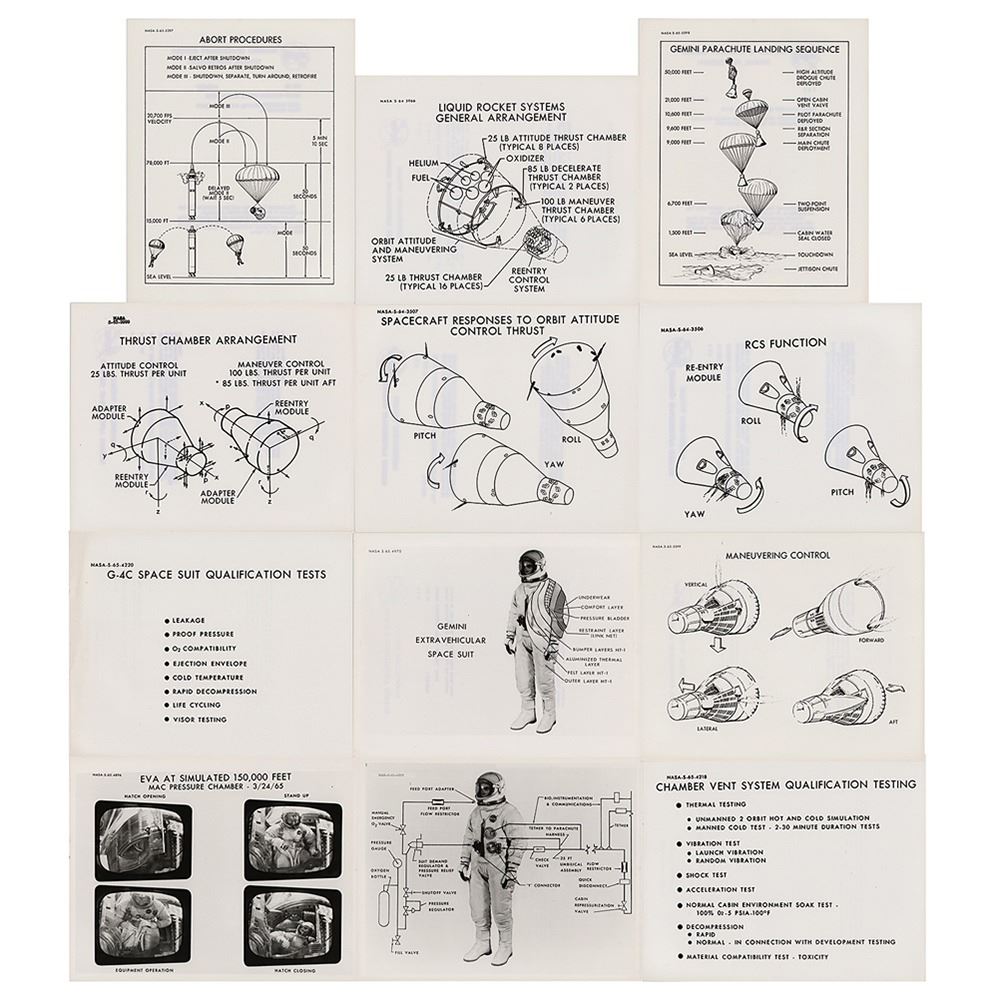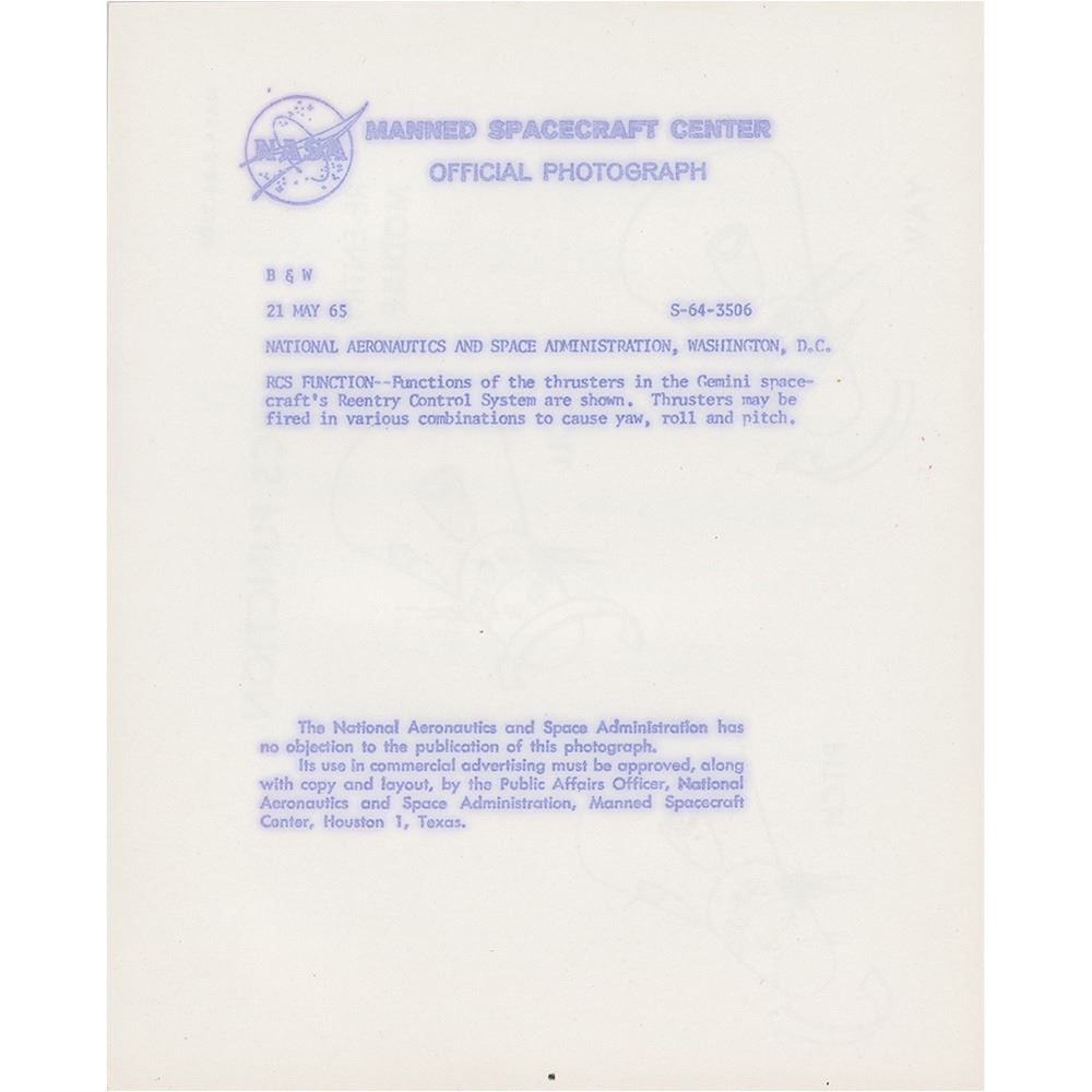 NASA astronaut Jim McDivitt‰Ûªs lot of 12 original vintage glossy NASA photos related to the function and testing of the Gemini space suit and spacecraft, each approximately 10 x 8 and numbered in the upper left corner. With the exception of one space suit photo, each example is entitled along the top, and read as follows: ‰ÛÏEVA at Simulated 150,000 Feet, MAC Pressure Chamber‰ÛÒ3/24/65,‰Û ‰ÛÏGemini Extravehicular Space Suit,‰Û ‰ÛÏManeuvering Control,‰Û ‰ÛÏAbort Procedures,‰Û ‰ÛÏGemini Parachute Landing Sequence,‰Û ‰ÛÏLiquid Rocket Systems General Arrangement,‰Û ‰ÛÏSpacecraft Responses to Orbit Attitude Control Thrust,‰Û ‰ÛÏRCS Function,‰Û ‰ÛÏG-4C Space Suit Qualification Tests,‰Û and ‰ÛÏChamber Vent System Qualification Testing.‰Û The reverse of four photos bear black NASA caption text, and the balance features purple NASA caption text with the ‰Û÷meatball‰Ûª logo, all of which are dated to May 1965. In overall fine condition, with some light edgewear like creases or short tears. Accompanied by a letter of provenance stating that the photos were purchased at the McDivitt family estate sale held in Tucson, Arizona, on April 1, 2022.