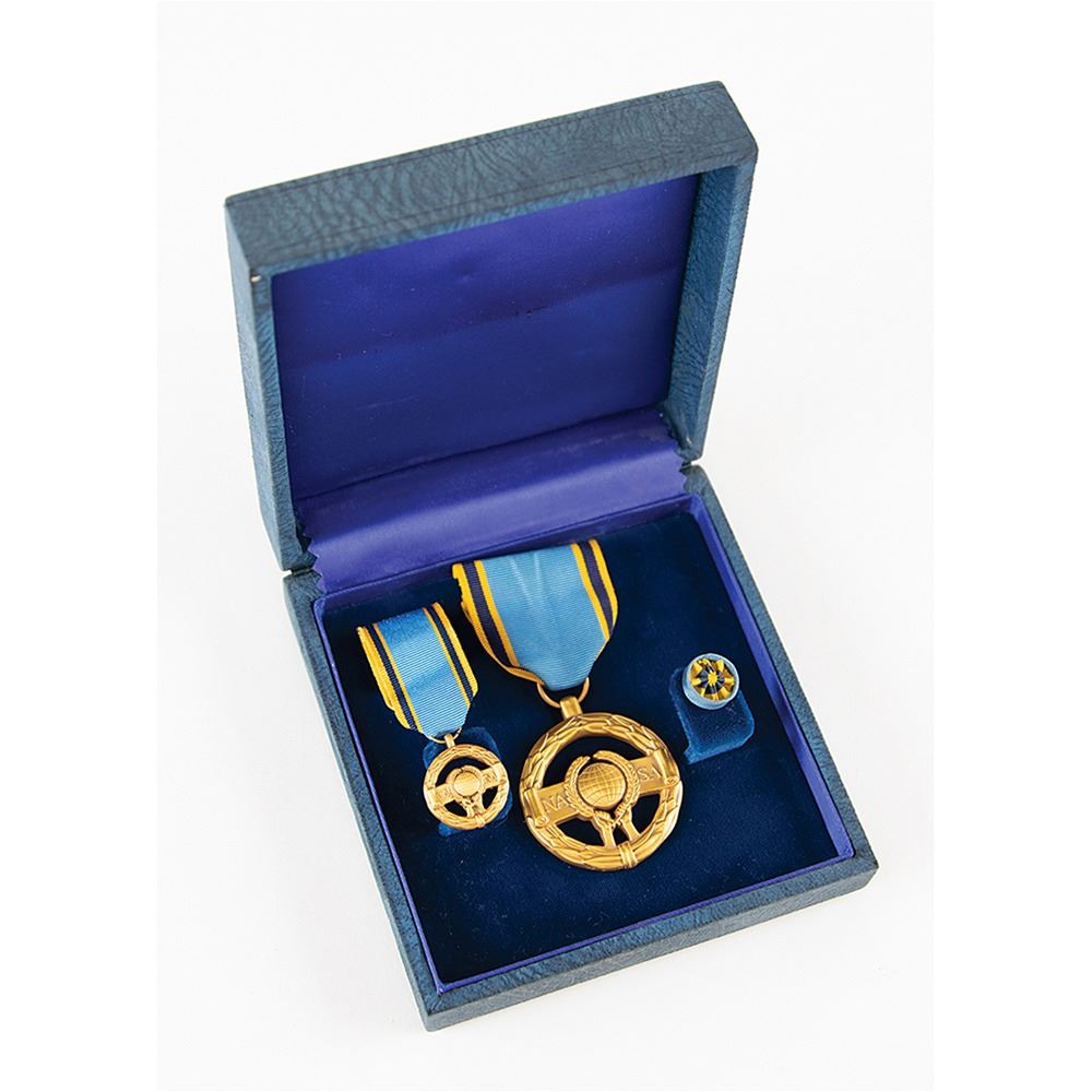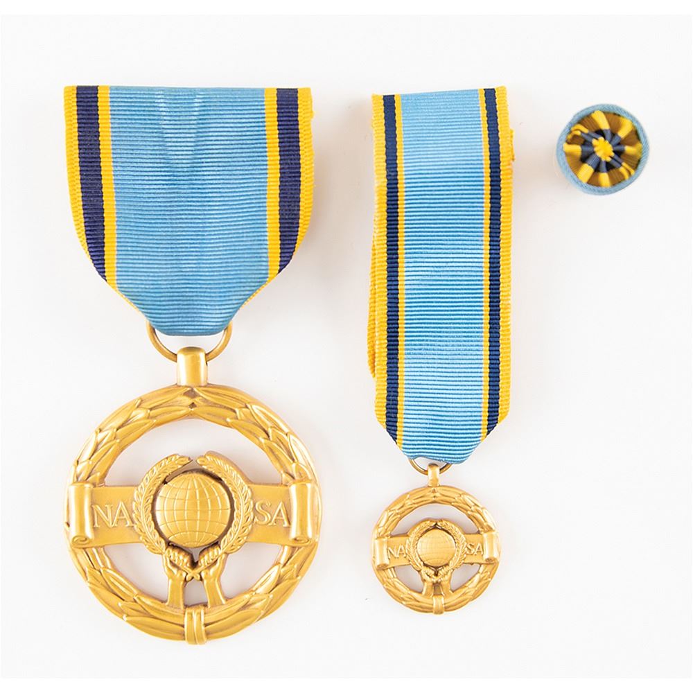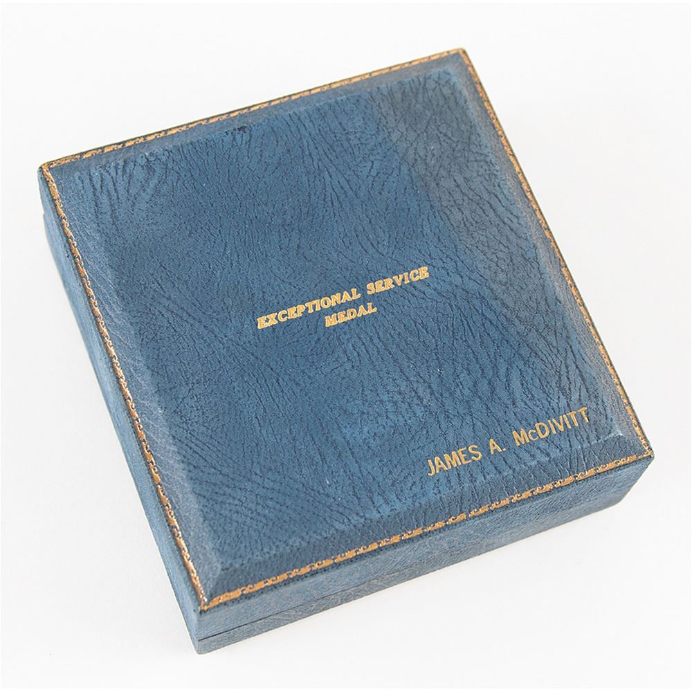 NASA Exceptional Service Medal issued to Jim McDivitt in 1965, measuring 1.5è in diameter and suspended from a 1.5è long blue-and-gold ribbon pin. The gold-colored medal features a globe in the center encircled by laurels, with a scroll reading "NASA" across the middle. The reverse is engraved with the date and name of the award's recipient, "James A. McDivitt, June 11, 1965." The medal is housed in its original presentation box, stamped "Exceptional Service Medal, James A. McDivitt" on the lid, along with its matching miniature medal and rosette. In fine condition. Accompanied by a letter of provenance from the consignor, stating that he purchased the medal at an estate sale held at McDivitt's home in Tucson, Arizona, on March 29, 2022, as the family was preparing the property for sale.