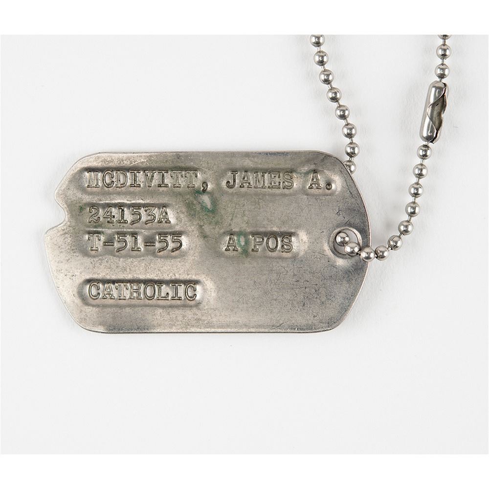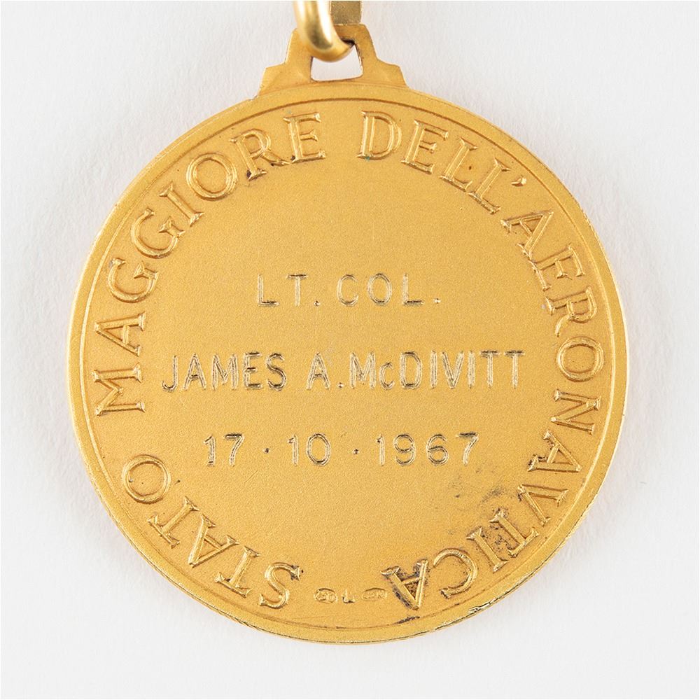 NASA astronaut Jim McDivitt‰Ûªs United States Air Force dog tag, impressed with his name, ‰ÛÏMcDivitt, James A.,‰Û service number, ‰ÛÏ24153A,‰Û tetanus dates, ‰ÛÏT-51-55,‰Û blood type, ‰ÛÏA Pos,‰Û and his religion, ‰ÛÏCatholic.‰Û Attached to the chain is an Italian Staff of the Air Force medallion, 1.25è in diameter, with the front featuring the raised design of a screeching eagle against a mountain backdrop, and the reverse engraved, ‰ÛÏLt. Col. James A. McDivitt, 17 - 10 - 1967,‰Û with encircling text in relief, ‰ÛÏStato maggiore dell'Aeronautica.‰Û In fine condition. Accompanied by a letter of provenance stating that the dog tag with medallion were purchased at the McDivitt family estate sale held in Tucson, Arizona, on April 1, 2022.