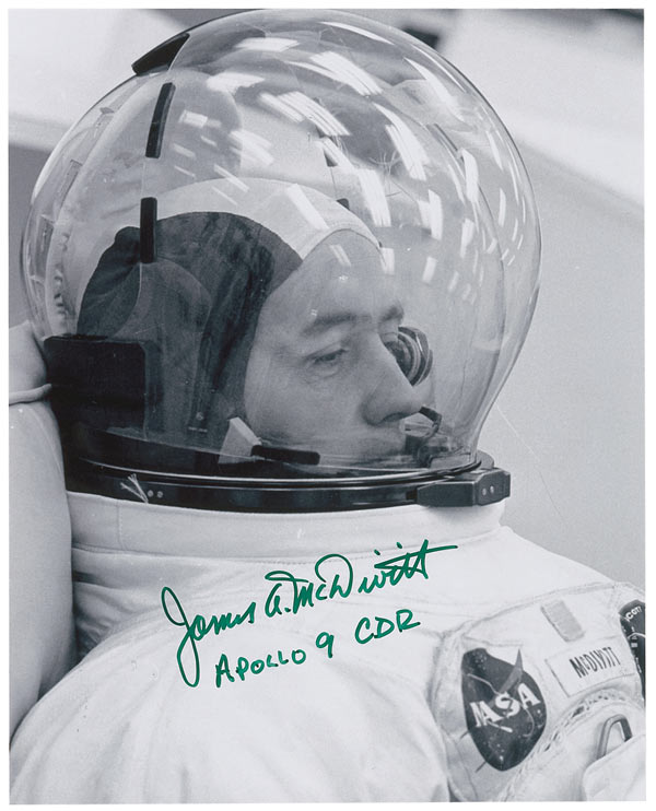 Glossy 8 x 10 photo of McDivitt looking pensive in his spacesuit and helmet prior to his Apollo mission, signed in green felt tip, “James A. McDivitt, Apollo 9 CDR.” In very fine condition.