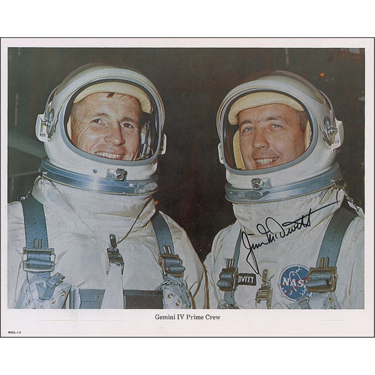 Color 10 x 8 NASA photo of McDivitt in his spacesuit with Ed White, signed in black felt tip by McDivitt. In fine condition.