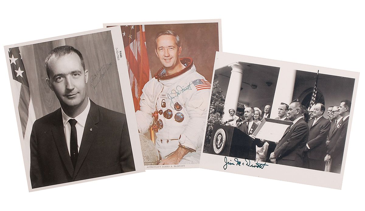 Three signed photos: vintage glossy 8 x 10 NASA photo of McDivitt in a business suit, signed in black ballpoint “Best Wishes, James A. McDivitt”; a laser print 10 x 8 photo of McDivitt being honored by President Lyndon B. Johnson, signed at the bottom white border in green felt tip; and a color NASA 8 x 10 photo of McDivitt in his spacesuit, signed in green felt tip. In fine condition. One photo is accompanied by a certificate of authenticity from Novaspace.