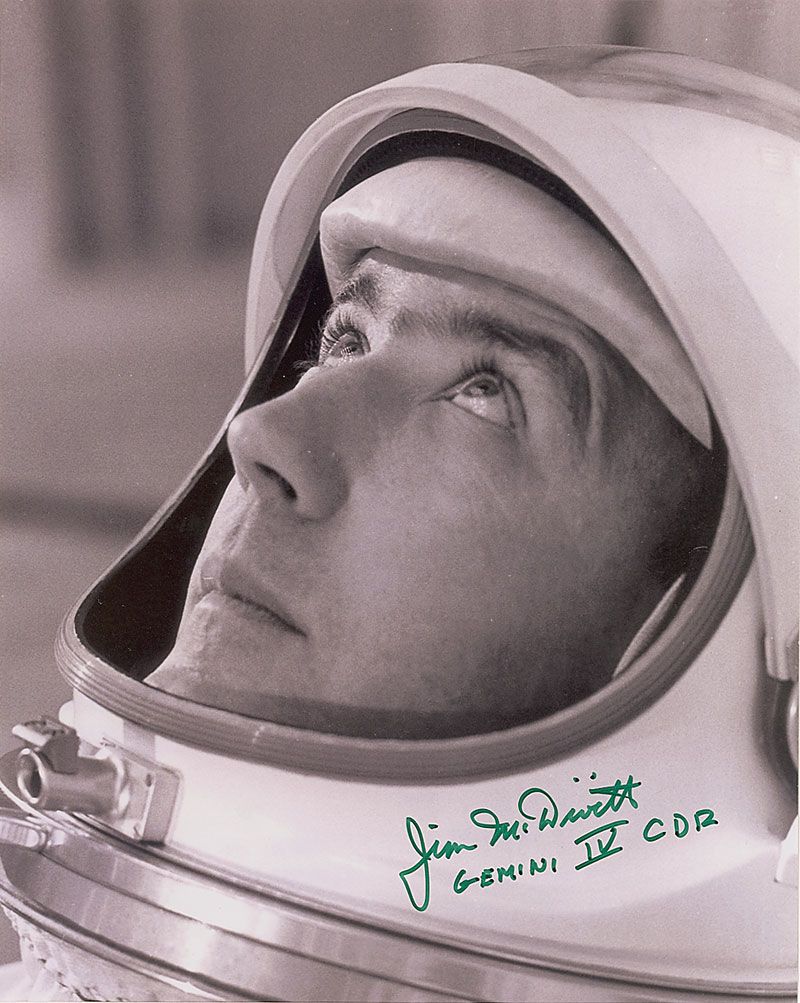 Satin-finish 8 x 10 close-up photo of McDivitt shortly before his Gemini mission, signed in green felt tip, “Jim McDivitt, Gemini IV Cdr.” In very fine condition.