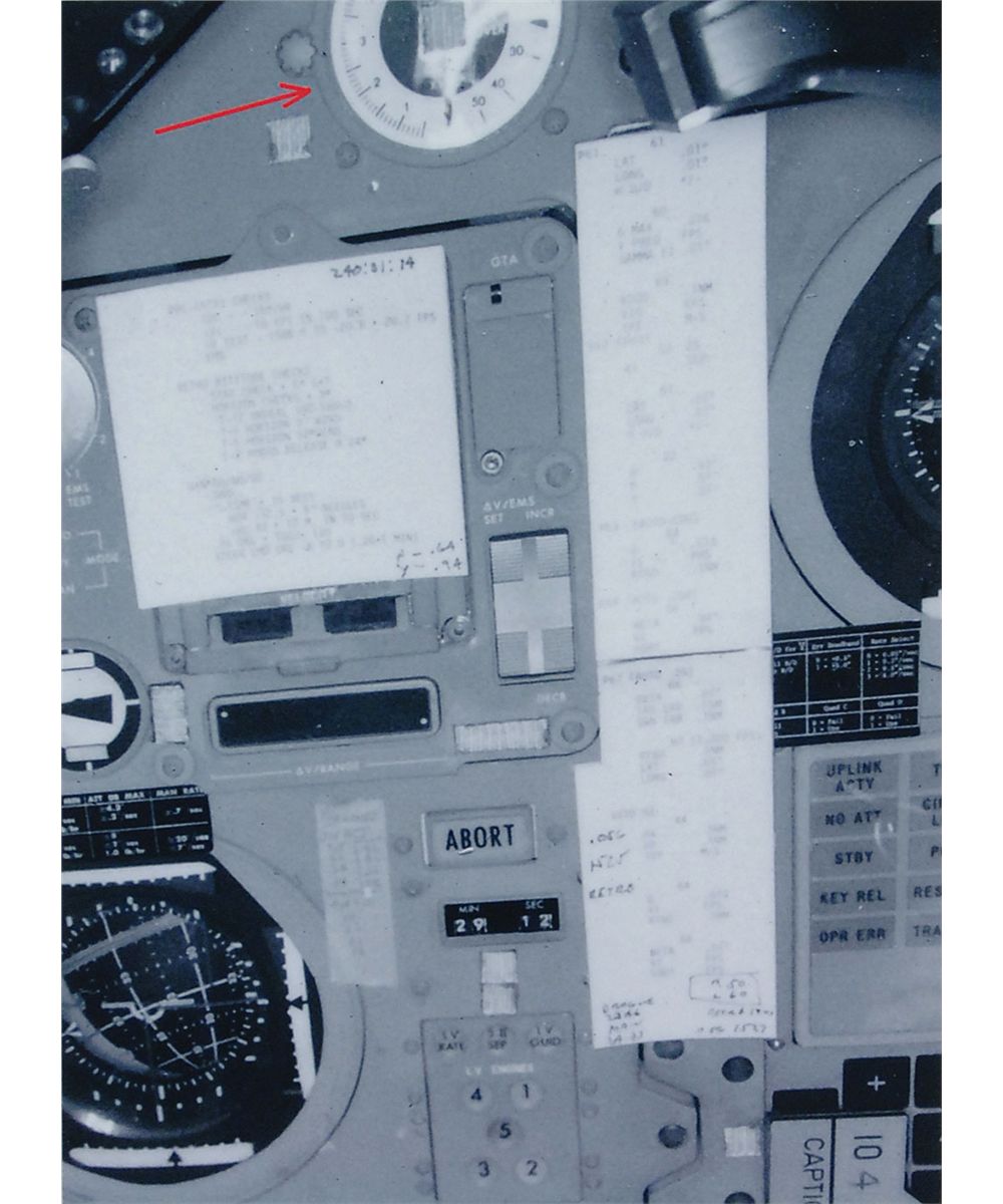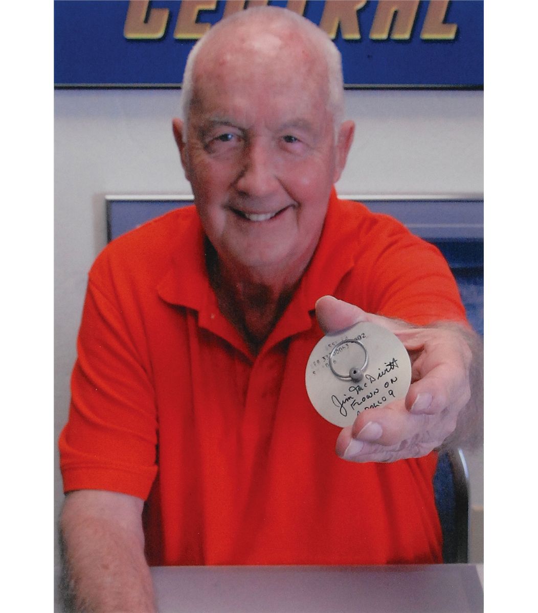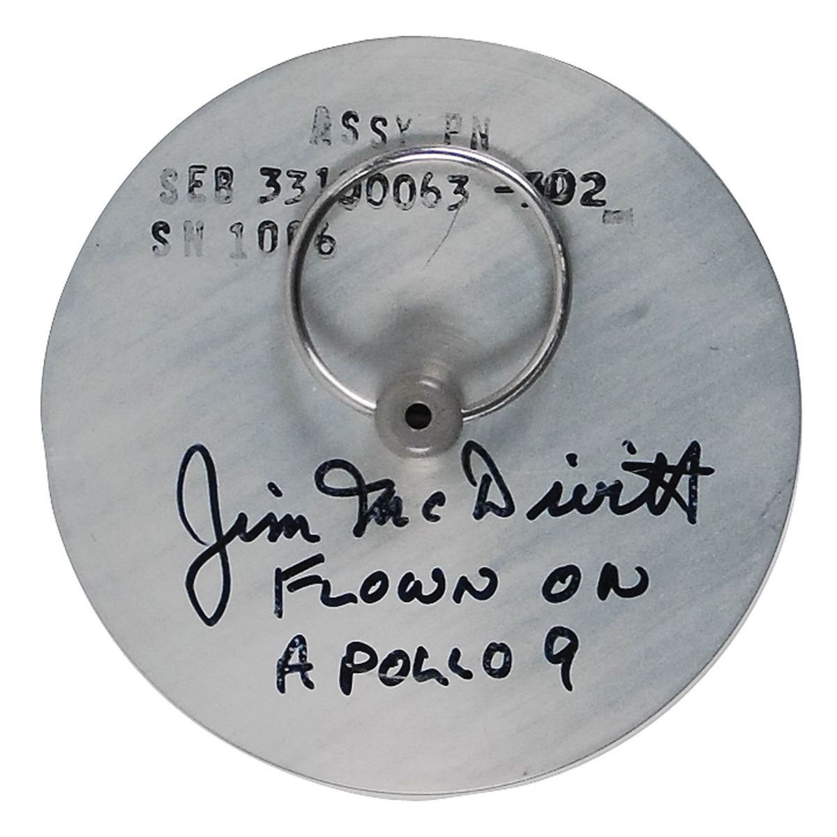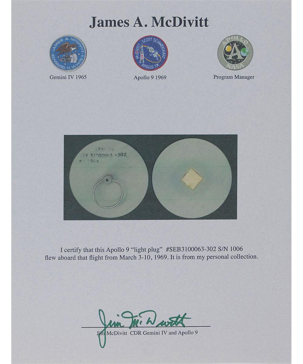 Flown altimeter cover carried on board the command module during the Apollo 9 mission. Aluminum cover measures approximatelty 2.75? in diameter, with a pull ring affixed to the front, and a small square of Velcro affixed to the reverse. Part is numbered “SEB 33100063-302 S/N l006,” and is signed on the front in black felt tip, “Jim McDivitt, Flown on Apollo 9.” Accompanied by a certificate of authenticity signed by McDivitt, a photo of McDivitt holding the cover after signing, a photo of the control console showing the altimeter (with a corresponding square of Velcro) at the top, and another composite photo of the console, again showing the altimeter. The Altimeter in the Apollo CM (panel l-A) indicates pressure altitude of the command module up to 60,000 feet, therefore it was only used by the crew during the early stages of initial powered ascent and then again at the very end of the mission. The altimeter is monitored to verify deployment of drogue and main parachutes at proper altitude. An adjustable marker on the dial is set prior to launch and is used as reference for manual deployment of main parachutes during an abort below approximately 10,000 feet. For the rest of the mission the altimeter was typically covered by this aluminum stopper. Flown, astronaut–certified items are always in supremely high demand.