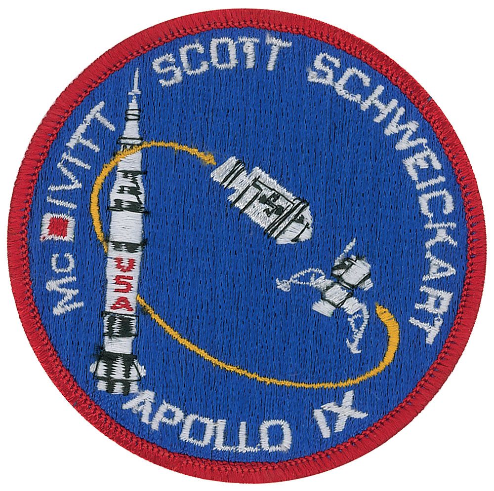 Flown official Apollo 9 mission patch, 3.25? in diameter, signed and flight-certified on the reverse in green felt tip, “Flown aboard Apollo 9, Jim McDivitt.” In fine condition.