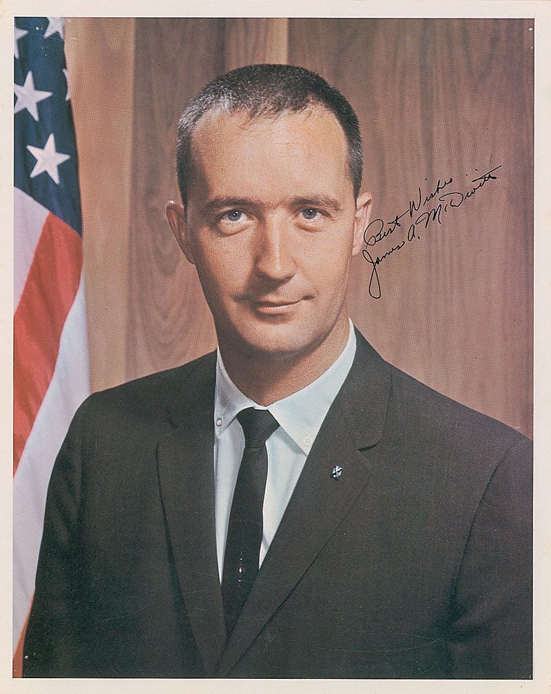 Color vintage 8 x 10 NASA photo of McDivitt in a suit and tie, neatly signed in black ink, “Best wishes, James A. McDivitt.” In fine condition.