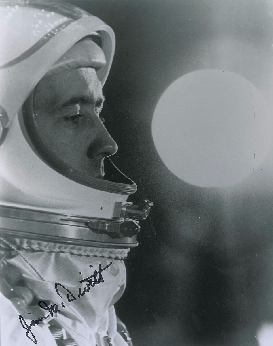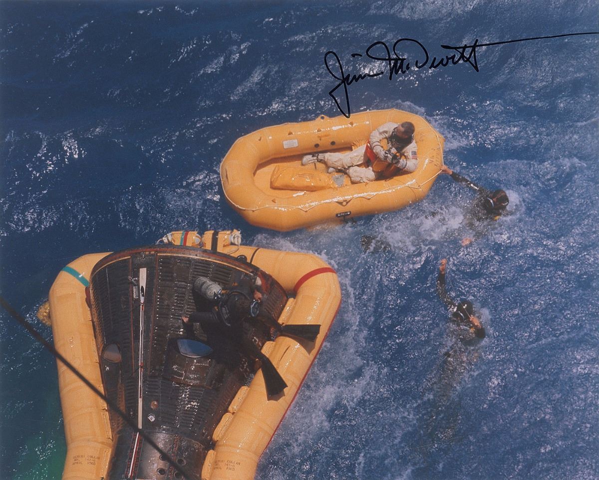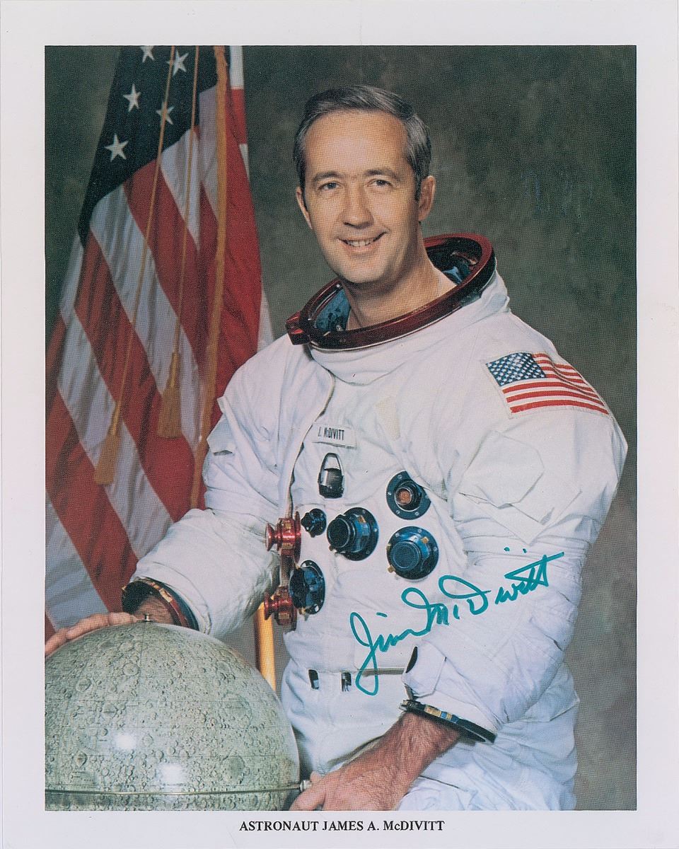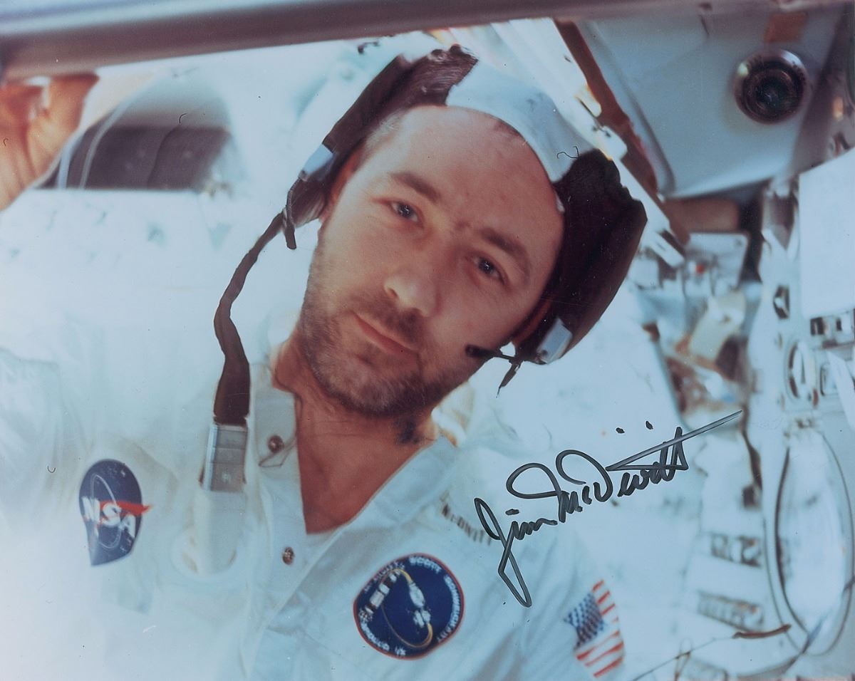 Set of four photos depicting McDivitt at various points of the Apollo 9 mission, 8 x 10 and 10 x 8, each signed in felt tip. In overall fine condition. The Leon Ford Collection.