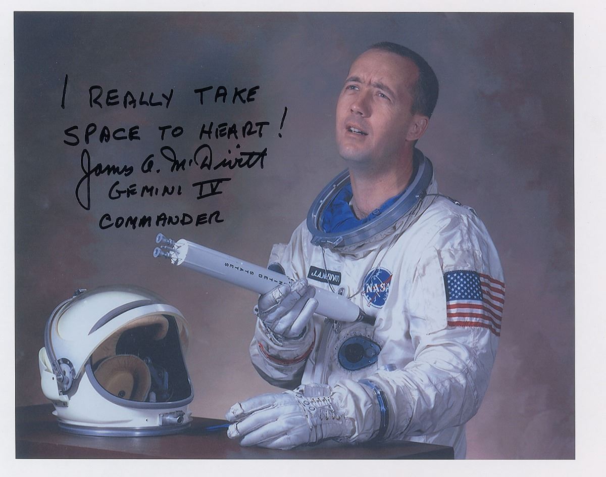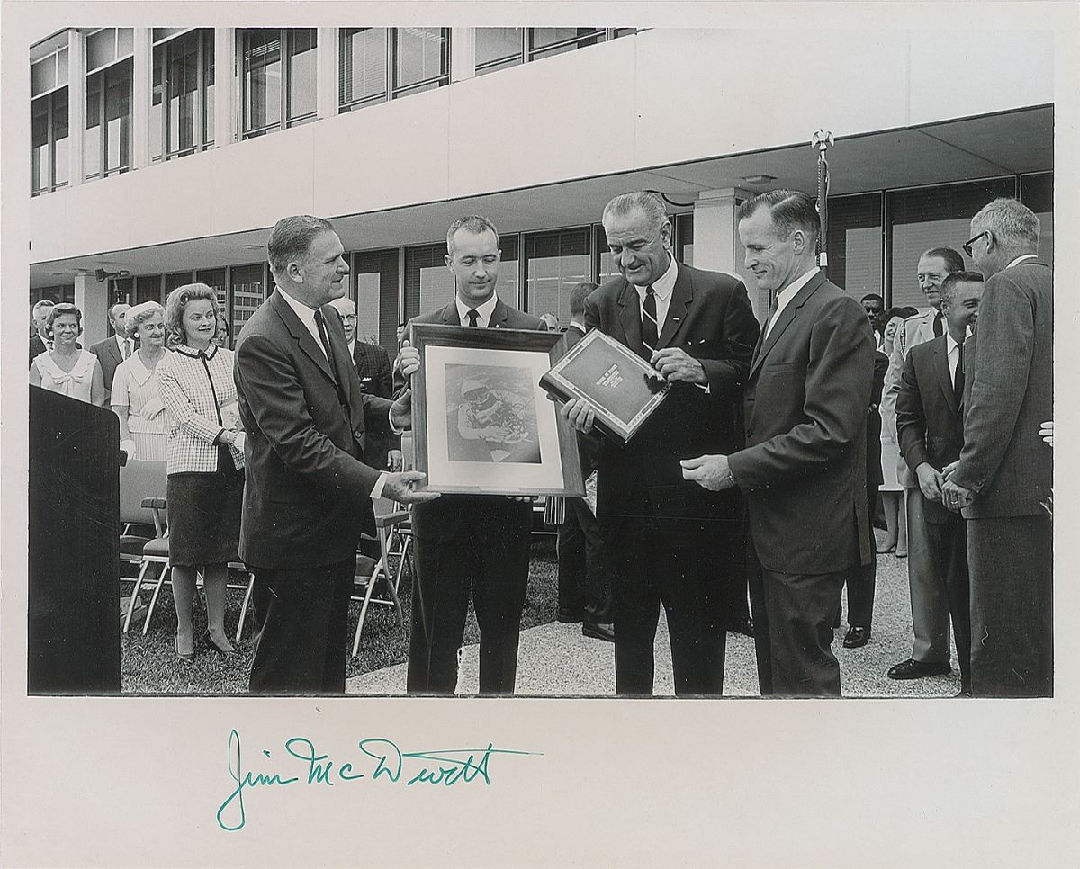 Two photos: a glossy 10 x 8 photo of Jim McDivitt and Ed White posing with President Johnson at a Gemini 4 ceremony, signed in the lower border in green ink by McDivitt; and a humorous color satin-finish 10 x 8 photo of McDivitt in his white space suit, pushing a model rocket into his chest, signed in black felt tip, “I really take space to heart! James A. McDivitt, Gemini IV, Commander.” In overall fine condition. Accompanied by a certificate of authenticity from the Novaspace ‘Jim McDivitt Garage Sale’ for the president photo.