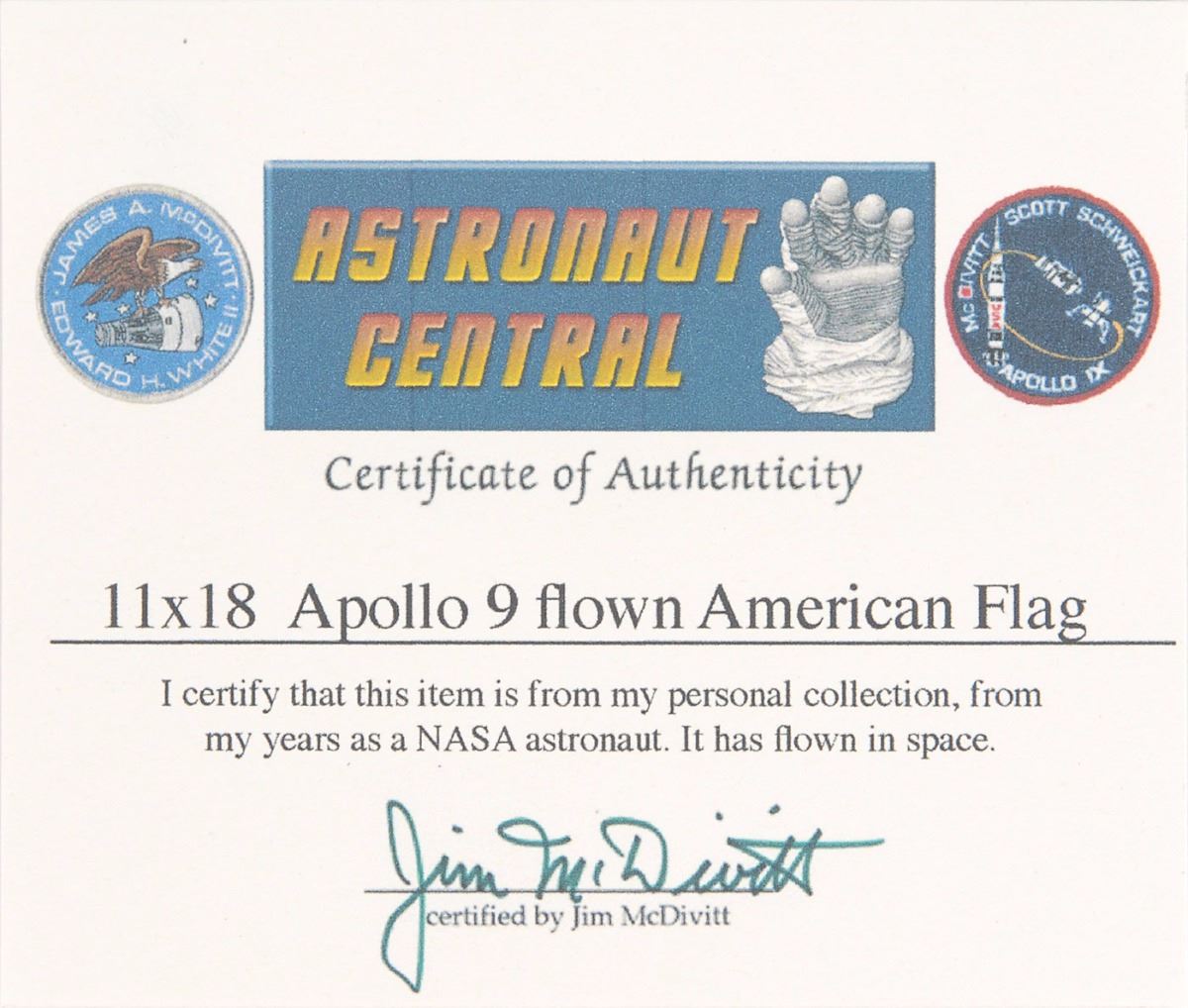 Jim McDivitt's flown American flag, 17.25 x 11.25, signed on the white stripes in black ink, "Flown on Apollo 9, Jim McDivitt." In fine condition. Accompanied by a certificate of authenticity from Astronaut Central, stating that the flag comes from McDivitt's personal collection. Nicely signed by the mission commander, this patriotic extension of earth-to-moon exists as the largest flown example of an Apollo 9 flag we have offered. Pre-certified Zarelli Space Authentication.