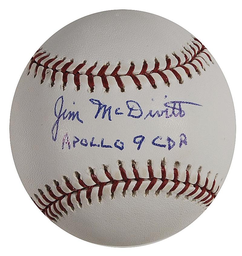 Official Rawlings Major League baseball signed in blue ballpoint on the sweet spot, “Jim McDivitt Apollo 9 CDR.” Accompanied by a certificate of authenticity from Novaspace. In very fine condition. Pre-certified Scott Cornish and RRAuction COA.