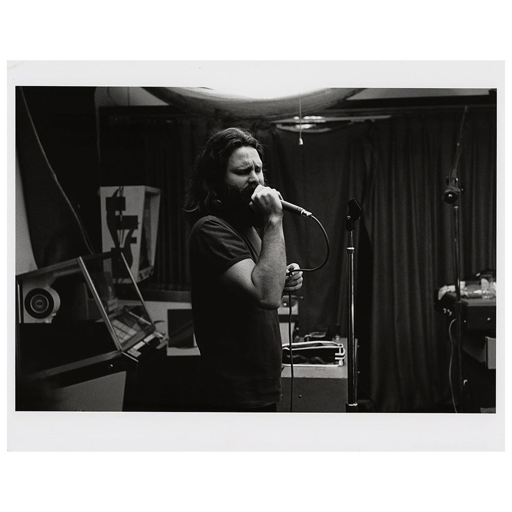Appealing original satin-finish 14 x 11 photo of Jim Morrison by Frank Lisciandro, depicting the Doors’ bearded frontman singing in the band’s Hollywood rehearsal space. The reverse bears Lisciandro’s handwritten copyright notation dated to 1981. In fine condition.