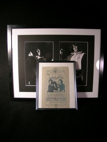 Two rare items from the legendary Jim Morrison and The Doors. First is a framed set of two B&W photos that capture the essence of Jim Morrison in concert (measures approx. 17"x 21"). The second item is a framed handbill advertising a concert at the Berkely Community Center with The Doors and 60's rock band Iron Butterfly (measures approx. 8"x 10"). Oversized item. Additional postage required.