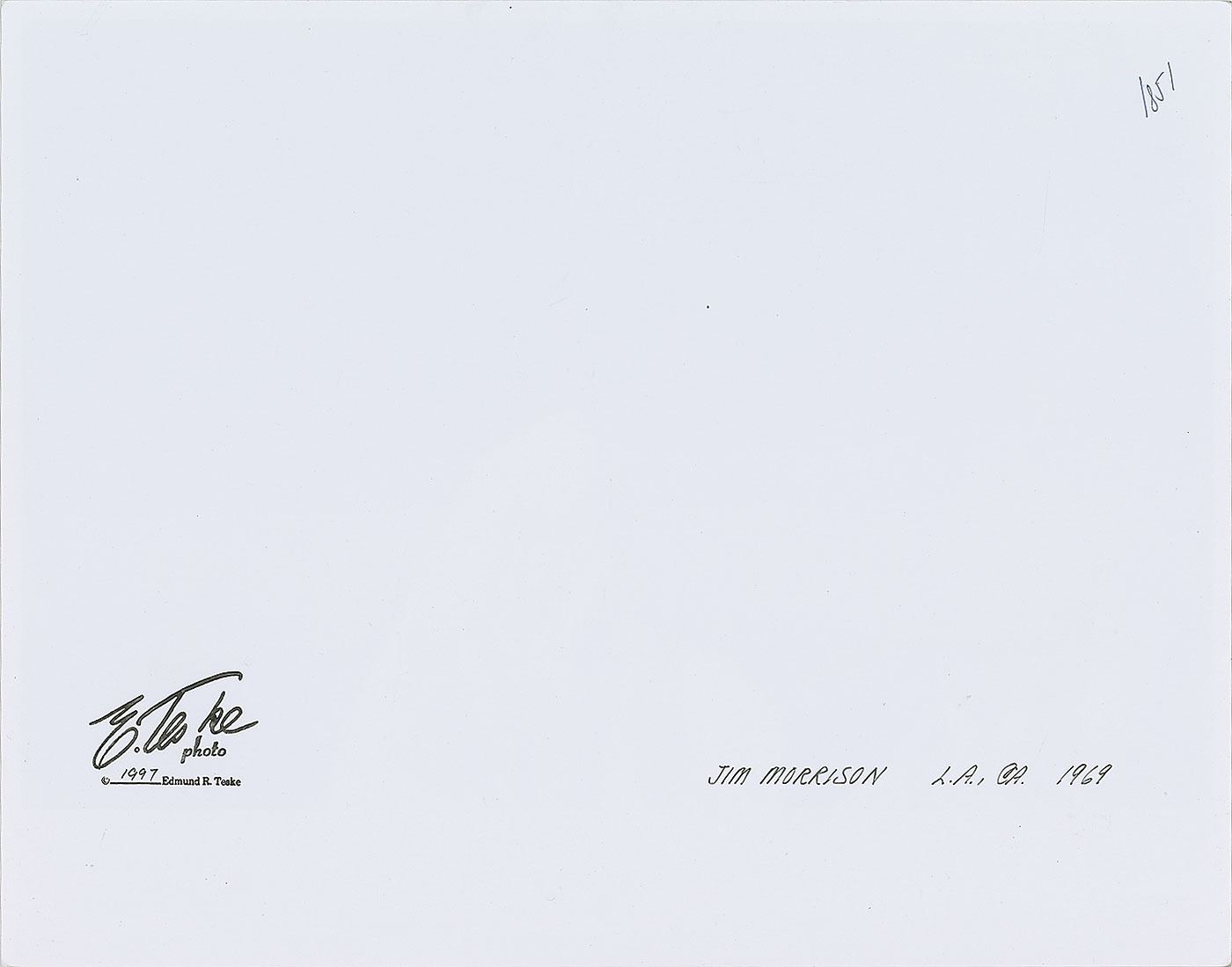 Original glossy 14 x 11 silver gelatin photo of a thickly bearded Jim Morrison in Los Angeles in 1969, printed from the original negative circa 1997. Reverse bears an Edmund Teske copyright stamp. In fine condition. Edmund Teske was a highly regarded fine art photographer who photographed The Doors and Jim Morrison in 1969 and 1970. His work was exhibited at major galleries and museums including the Museum of Modern Art in New York, The Art Institute of Chicago, The Pasadena Art Museum, The San Francisco Museum of Modern Art, and a one-man exhibition at Los Angeles’ J. Paul Getty Museum. His images appear on The Doors’ 'American Prayer' and '13' albums.