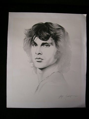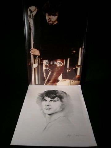 From one of the greatest bands of all time, this is a lot of (2) pieces featuring lead singer Jim Morrison of the Doors. The first is a large size color concert photo featuring Jim Morrison holding a microphone in one of his trademark poses (measures approx. 30 1/2"x 20 1/2"). The second is a Jim Morrison portrait drawing on white card stock. (measures approx. 24"x 20"). Oversized item. Additional postage required.