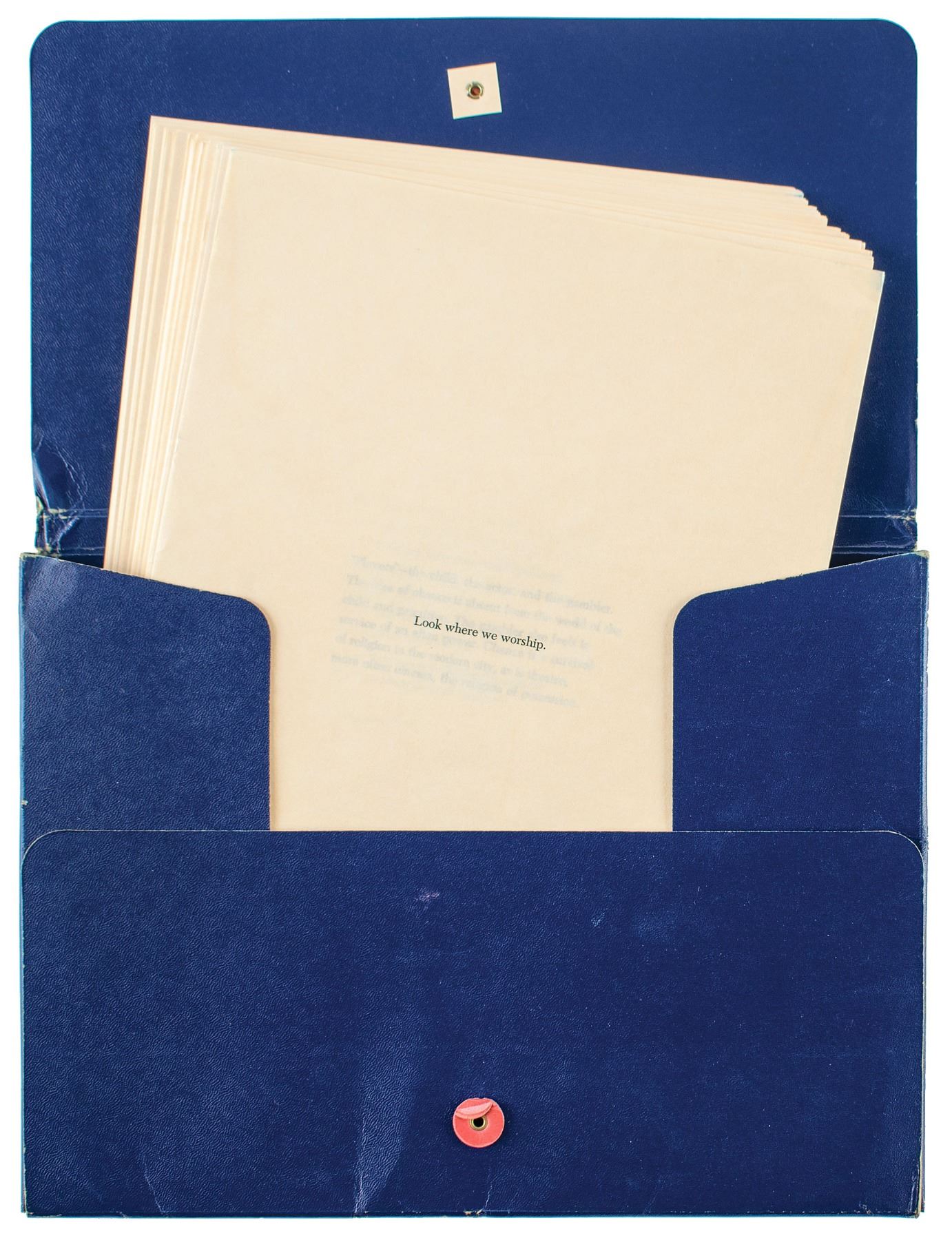 Exceedingly rare unsigned book: The Lords: Notes on Vision. First edition, printed as a limited issue of 100 copies. Self-published and privately printed by Western Lithographers, Los Angeles, 1969. Housed in the original blue portfolio with red string tie and gilt lettering, "The Lords / Notes on Vision / James Douglas Morrison," 8.5 x 11, 82 loose-leaf pages. These unbound pages could be rearranged in any order by the reader. In very good to fine condition, with edgewear and light creasing to the portfolio, folds and creases to the portfolio's red cardstock tiedowns, and traces of adhesive where flaps were once sealed; inner pages are fine with some very mild corner creasing and some slight color transfer from the navy blue portfolio to page edges. This rare edition of Morrison's first self-published poetic work was given to Tony Glover in June 1969.