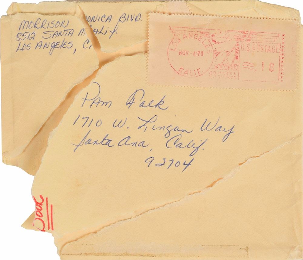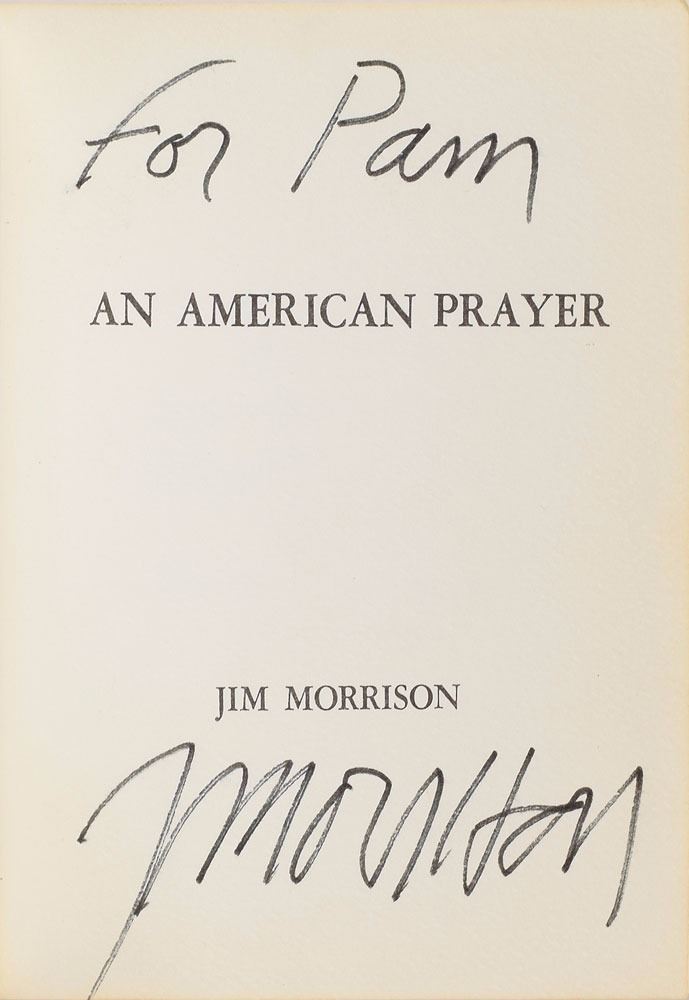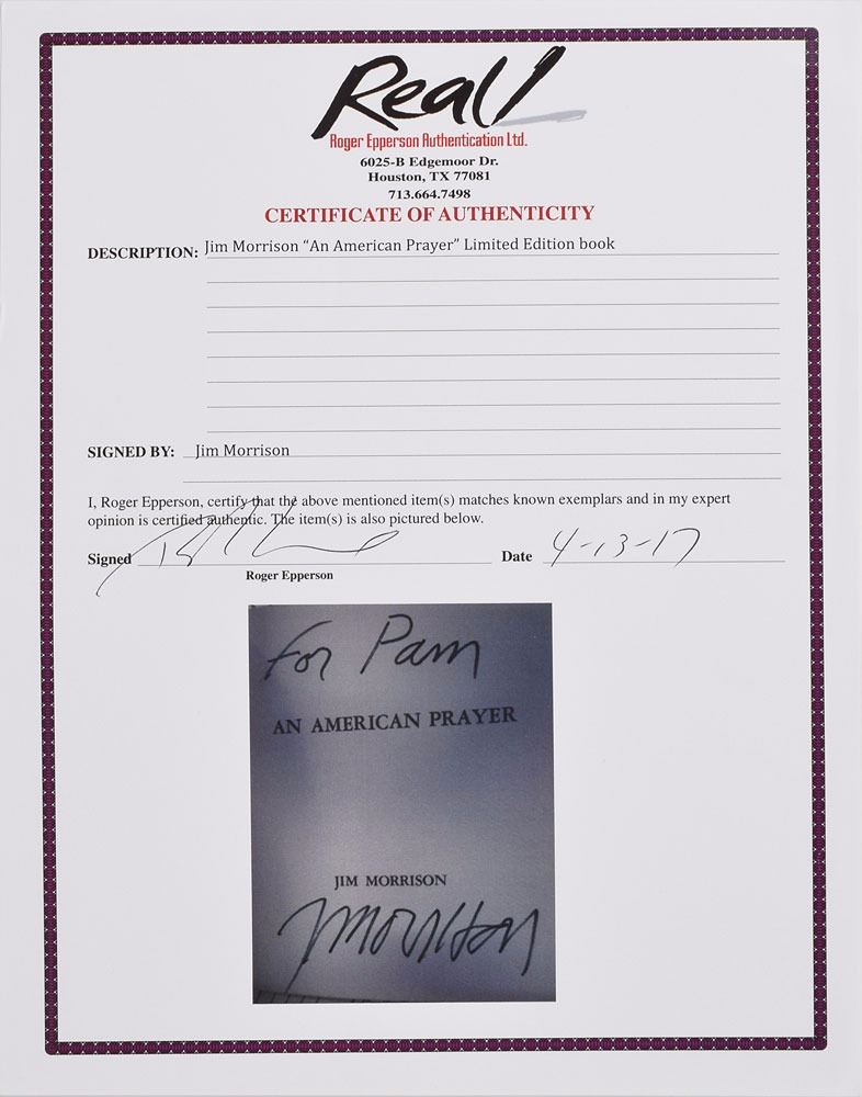 Signed book: An American Prayer. Published by James Douglas Morrison in 1970. Faux red leather paper boards with gilt lettering, 4 x 4.75, 40 pages. Signed and inscribed on the title page in black felt tip, "To Pam, J. Morrison." In fine condition, with trivial toning to first free end page, and a ding to upper right corner of front paper board. Accompanied by a full letter of authenticity from REAL, as well as the original mailing envelope, postmarked Los Angeles, November 4, 1970, and addressed by an unknown hand. Printed by Western Lithographers of Los Angeles in the summer of 1970, Morrison self-published a total of 500 copies of this rare book, purportedly divvying them amongst his family and close friends. This terrifically scarce signed edition features lyrics to Morrison's poem 'An American Prayer,' the eventual title track for The Doors' ninth and final studio album, and represents Morrison’s unique and visceral style of poetry.