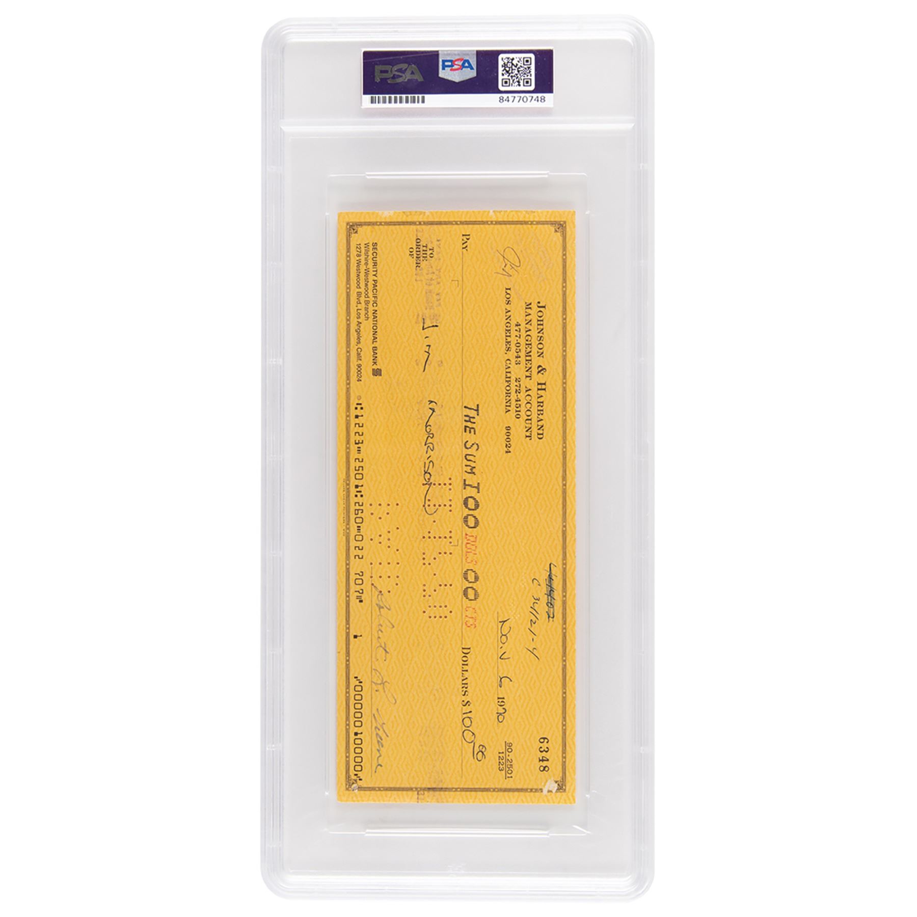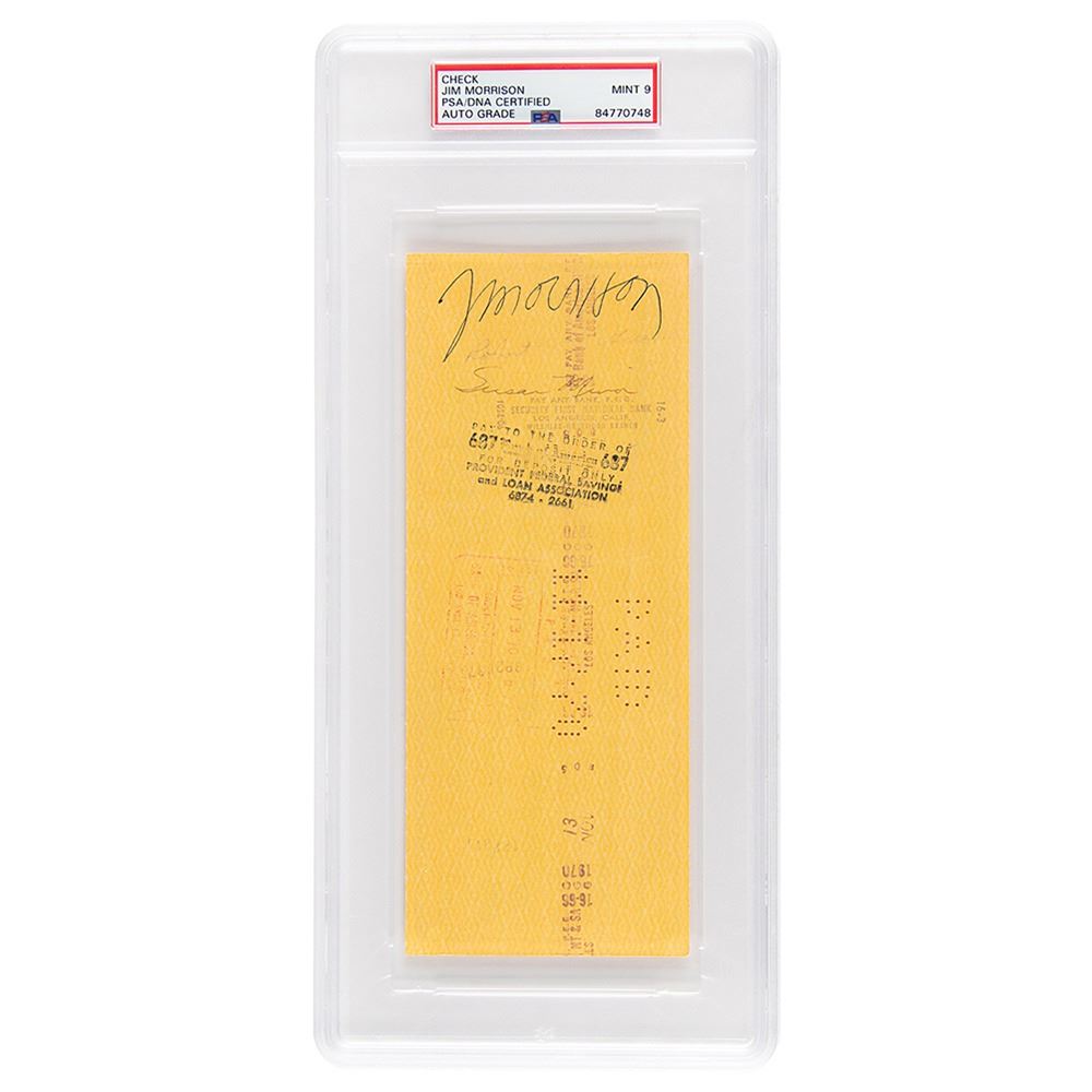 Johnson & amp; Harbrand Management Account business check, 8.25 x 3.25, filled out in another hand and signed by Robert Greene, The Doors& #39; first business manager and accountant, payable to Jim Morrison for $100, November 6, 1970. Endorsed on the reverse in black ballpoint, "J. Morrison," as well as by Greene and one other. In fine condition. Encapsulated and graded by PSA/DNA as "MINT 9."