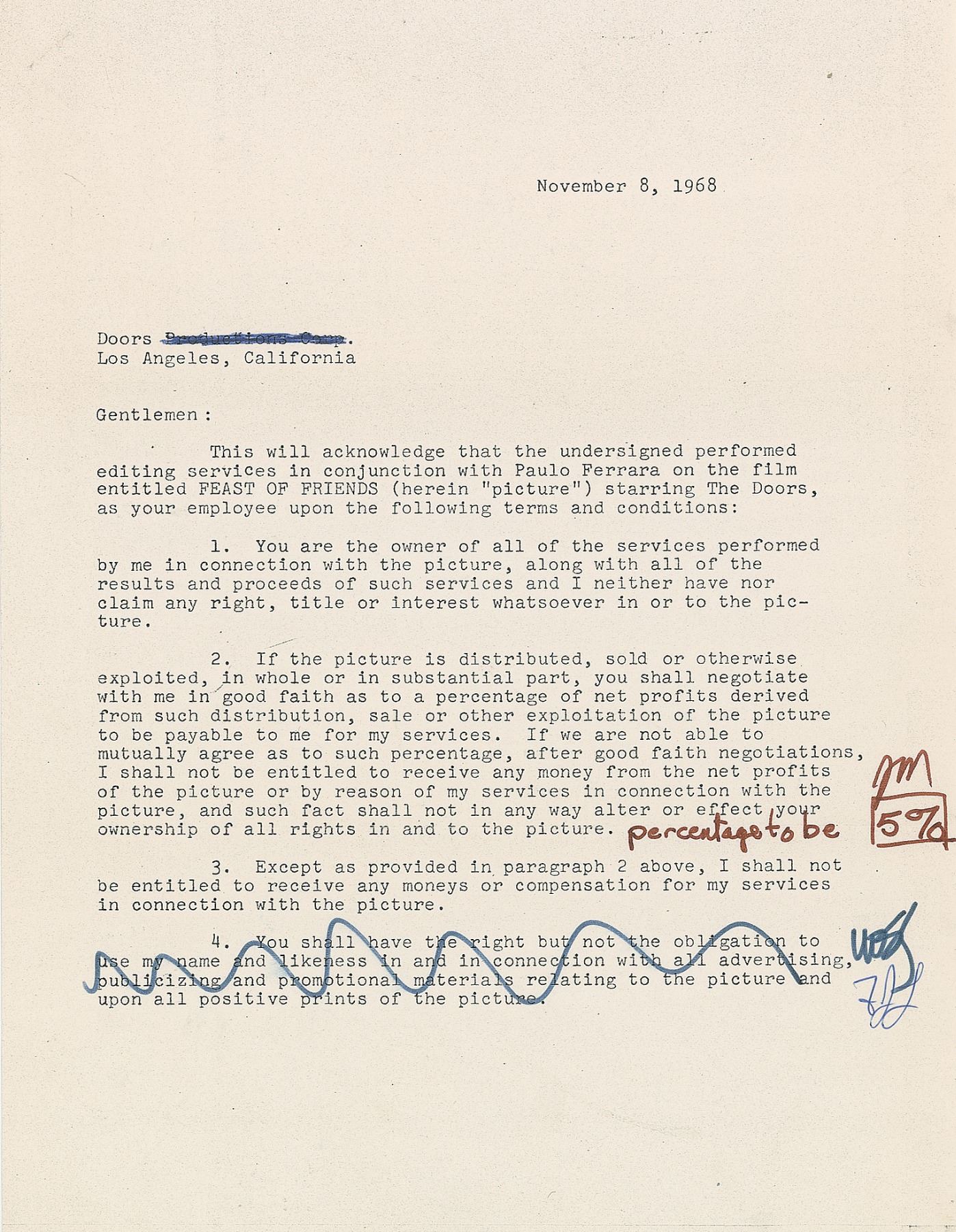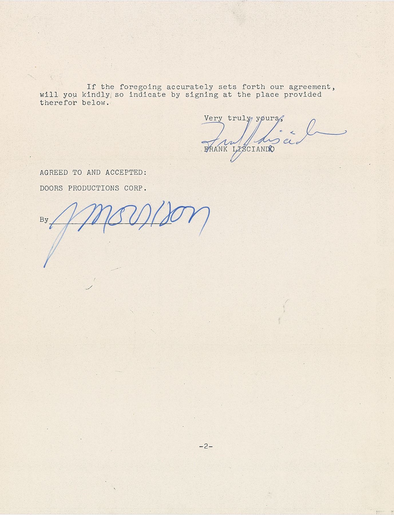 DS, signed “J. Morrison,” two pages, 8.5 x 11, November 8, 1968. Contract between Doors Productions Corp. and Frank Lisciandro concerning his "editing services in conjunction with Paulo Ferrara on the film entitled Feast of Friends." The document lists an amended section related to "net profits derived from such distribution, sale or other exploitation of the picture," with a brown felt tip notation affirming the "percentage to be 5%." Signed at the conclusion in blue felt tip by Morrison, and countersigned by Lisciandro. Morrison adds his initials, "JM," to the amended percentage. In fine condition.