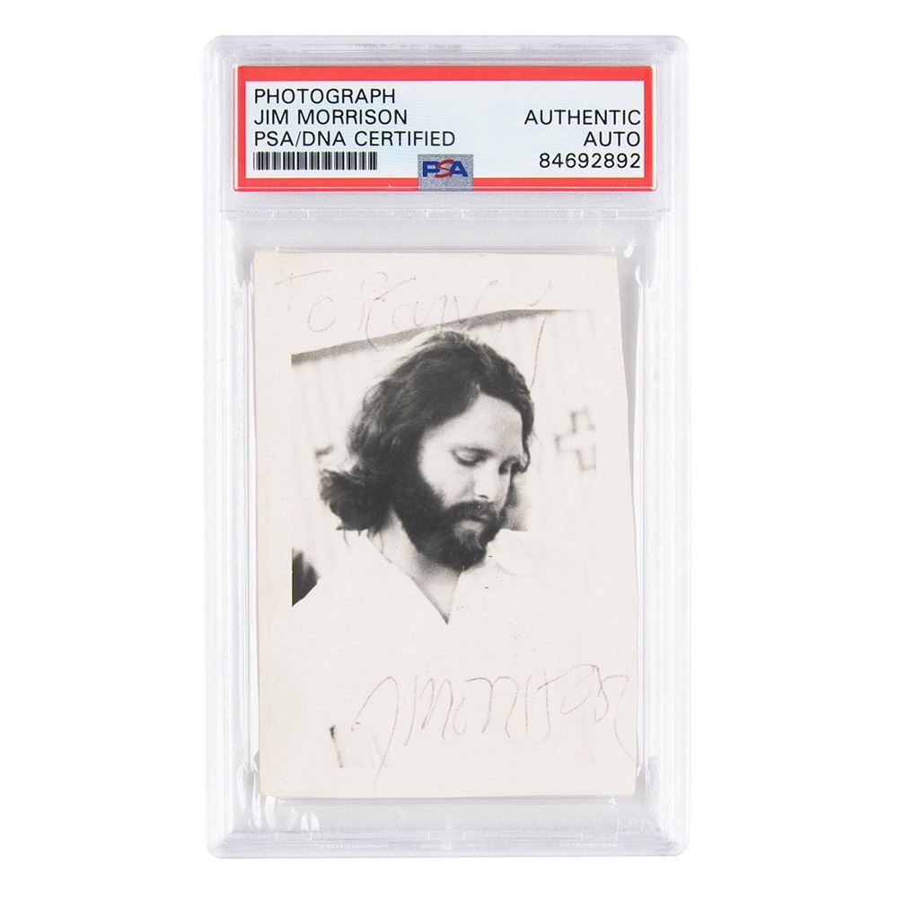 Scarce vintage glossy 2.25 x 3.5 photo of the bearded Jim Morrison in a white shirt, apparently inside a church, signed and inscribed in ballpoint, "To Randy, J. Morrison.& rdquo; Mounted, matted, and framed to an overall size of 9.25 x 10.25. In very good to fine condition, with slightly irregular trimming to the right edge, and fading to the signature and inscription, all of which remain entirely legible. Originally acquired from a collector who got it signed in Miami as Morrison was leaving his famed indecent exposure trial. Encapsulated in a PSA/DNA authentication holder.