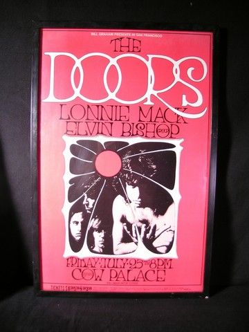 A lot of (2) vintage posters from the iconic 1960's rock band The Doors. First is a large size, framed color poster advertising a concert of The Doors, with guests Lonnie Mack and Elvin Bishop at the Cow Palace (measures approx. 15"x 22 1/2"). The second is also framed and features psychedelic poster art for a Doors concert, with the phrase 'Break on Through to the Other Side' printed on front. (measures approx. 21"x15"). Oversized item. Additional postage required.