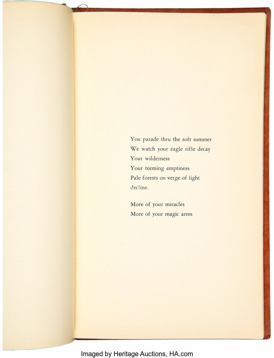Jim Morrison Very Rare Self-Published Book of PoetryThe New Creatures(1969). A soft-bound, self-published copy of Jim Morrison's 1969 book of poetry. Only 100 were known to be made in its original run. The Doors' frontman is listed "James Douglas Morrison" on the cover. Copyright in 1969. 82 pages. Measures 5 ½" x 8 ¾". In Good condition with creasing throughout, spots of soiling throughout, and bumped corners (and water damage on the back end paper and cover). COA from Heritage Auctions.