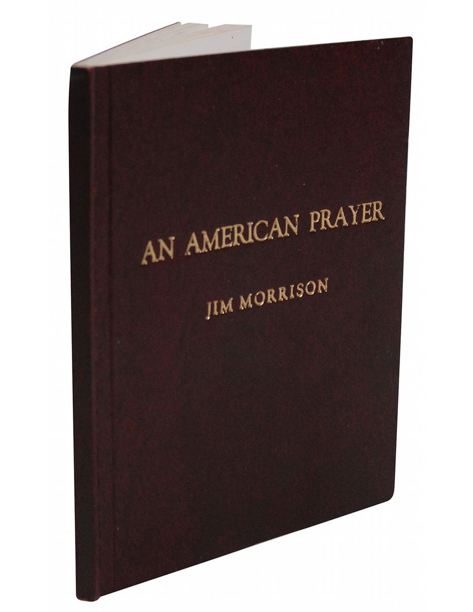 Rare signed book: An American Prayer. Privately published, 1970. Hardcover, 4 x 4.75, 40 pages. Signed and inscribed on the title page in brown felt tip, “For Doug Washington, J. Morrison.” Autographic condition: very fine. Book condition: VG+/None. Maroon heavy cardstock covers with gilt lettering to front; minor wear to edges, with a light bump to front and rear lower edges; minimal soiling to exterior. Morrison took poetry quite seriously, publishing a few small volumes of verse during his lifetime and often improvising poetic passages on stage. With a limited printing of somewhere between 100 and 500 copies, this is a rarely found and extremely desirable book.