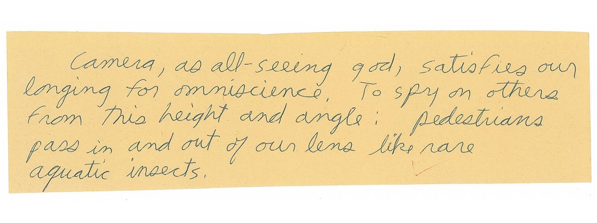 Handwritten poetry verse, unsigned, on a light yellow 8 x 2 slip clipped from a larger page. Verse reads, in full: “Camera, as all-seeing god, satisfies our longing for omniscience. To spy on others from this height and angle: pedestrians pass in and out of our lens like rare aquatic insects.” In fine condition, with a couple of light creases.