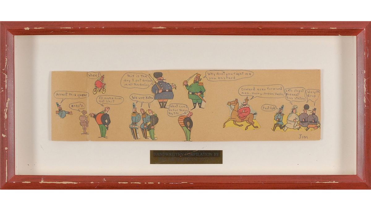 Handmade collage comic strip circa 1957, signed “Jim,” on an off-white 14.5 x 4 sheet. Comic features clipped cartoon characters, many of which are military or royalty, affixed to the sheet, with speech bubbles written by Morrison beside each one. From left to right, the words read: “Arrest this queen…H=80(2)H…Whee!…I’ll make him eat shit…This is the day I put Drano in all the drains…We use Kotex…What can I do for these big tits?…Why Don’t you fight me you bastard…Onward ever forward men. Hurry, Hubba Hubba…Pant puff…Let’s stop at the next gas station…We gotta crap.” Nicely float-mounted and framed in a shadowbox to an overall size of 20 x 9. In fine condition. A very unique piece presenting one of the earliest outlets of the future rock icon’s creativity.