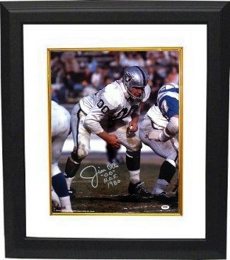 After no National Football League team showed interest in the undersized center, Jim Otto signed with the Oakland Raiders of the new American Football League. He was issued jersey number 50 for the AFL's inaugural season, 1960, but switched to his familiar 00 the next season. The AFL permitted the unusual number because it was a pun on Otto's name (aught-oh). Otto was one of only 20 players to play for the entire ten-year existence of the American Football League, and was selected as the Sporting News All-League center from 1960 through 1969. He was an All-Star in the first 13 of his 15 seasons (every year in the AFL from 1960 through 1969) and three of his five seasons in the NFL. He was also named the starting center on the AFL All-Time Team. He was elected to the Pro Football Hall of Fame in 1980. Jim Otto has hand signed this Oakland Raiders 16X20 photo with HOF 1980 inscription. PSA DNA hologram and Certificate of Authenticity. Custom White Mat and Premium Black Frame as shown.