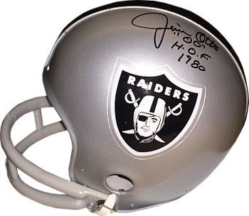 After no National Football League team showed interest in the undersized center, Jim Otto signed with the Oakland Raiders of the new American Football League. He was issued jersey number 50 for the AFL's inaugural season, 1960, but switched to his familiar 00 the next season. The AFL permitted the unusual number because it was a pun on Otto's name (aught-oh). Otto was one of only 20 players to play for the entire ten-year existence of the American Football League, and was selected as the Sporting News All-League center from 1960 through 1969. He was an All-Star in the first 13 of his 15 seasons (every year in the AFL from 1960 through 1969) and three of his five seasons in the NFL. He was also named the starting center on the AFL All-Time Team. He was elected to the Pro Football Hall of Fame in 1980. Jim Otto has hand signed this Raiders Riddell Throwback 2bar Mini Helmet with HOF 1980. Certificate of Authenticity from Athlon Sports Collectibles.