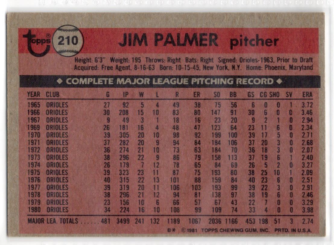 Jim Palmer 1981 Topps Card number 210