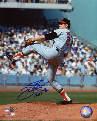 Jim Palmer has been considered one of the best pitchers in Orioles – and major-league – history. He was a mainstay in the rotation during Baltimore's six pennant-winning teams in the 1960s. Also, he is the only pitcher in big-league history to win World Series games in three decades (1966, 1970–71, 1983). Palmer won spots on 6 all-star teams, 4 gold gloves, 3 Cy Young Awards, and 2 ERA titles. He led the American League in victories three times. Palmer retired in 1984 as a member of the defending World Champions. He is a member of major league baseball's Hall of Fame. Jim Palmer has hand autographed this Baltimore Orioles 8x10 Photo with HOF 90 inscription. MAB Hologram and Certificate of Authenticity from Athlon Sports.