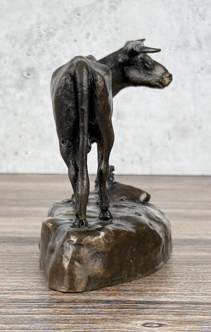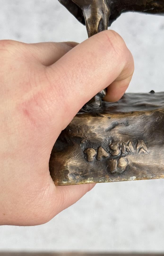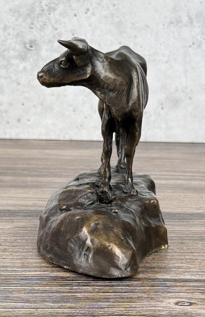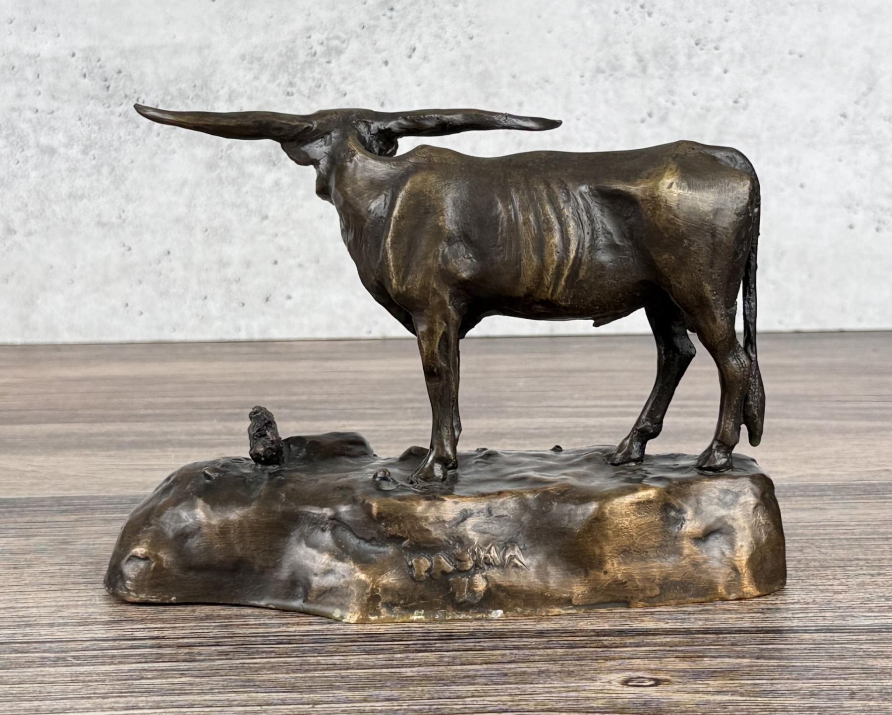 Title is Longhorn Steer. 7 1/4" by 5 1/8" by 3 1/2" Jim Pasma (1933 - 1999) was active/lived in Montana. Jim Pasma is known for Sculpture. Jim Pasma was known best for his political acumen. He was the chair of Hill County Democrats for more than three decades and was a force in state and national Democratic politics. But Pasma's real job during his political years was art. He painted and some of his works are still around Havre. But his passion and his financial success was bronze carvings. His work sells for thousands of dollars a piece in California, but it hasn't received its just due in Montana, feels Pasma's lifelong friend, Bill Thackeray. Thackeray organized a display of some of Pasma's bronze sculpture work that will be traveling around the Hi-Line. The sculptures are now on display at the North Central Senior Center, and people can stop by to see them throughout the day. The display is headed for libraries, schools and colleges around the area, he said, so people can understand the beauty and significance of Pasma's sculptures. Thackeray said Pasma created hundreds of pieces of work in his lifetime, which ended in 1999 when he succumbed to the lingering effects of radiation from an atomic bomb blast in New Mexico. His favorite subject was Native Americans and Native culture, and that is reflected in most of his sculptures. He designed sculptures in the workshop in his southside Havre home. There he could sculpt while keeping his eye on local politics, Thackeray said. The centerpiece of the display is called "Contemplation," a depiction of a Chippewa Cree mystic in prayer, shown in a photograph on the front page. Others includes a young pinto. He used a young horse at Fort Belknap as his model for that sculpture. There is a sculpture of Chief Joseph, the Nez Perce who surrendered with his band after the Battle of the Bear Paws south of Chinook and uttered his famous quote "from where the sun now stands, I will fight no more." Thackeray said he and Pasma attended Burnham School, a one-room school west of Havre. Pasma, he said, was a smart, energetic, friendly young man who hated going to school. He decorated the school with his paintings. After eighth-grade graduation, Pasma promptly signed up to join the U.S. Marines Though he was 15 and technically too young to enlist, he managed to get through enlistment officers. He brought Thackeray, who was years younger, along with him to enlist, but the Marines laugherd and turned away because he was too young. After he got out of the Marines, Pasma returned to Havre, and began his sculpting. The then-chair of the Democrats convinced Pasma to seek a seat on the party's county committee. The next thing he knew, Pasma was party chair, and he convinced Thackeray to seek a committee set, a position he holds 44 years later. As his power in the political world continued to rise he was on the campaign staff of Sen. Mike Mansfield and Sen. Robert Kennedy the arts world was paying attention to him. When his long time political ally Harriet Miller, Montana superintendent of public instruction, moved to California, she began selling his sculptures there. It was there, Thackeray said, that they started making big money.