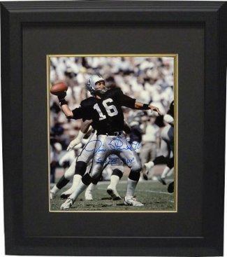 Jim Plunkett played college football for Stanford University, where he won the Heisman Trophy, and professionally for three National Football League teams: the New England Patriots, San Francisco 49ers and Oakland/Los Angeles Raiders. He led the Raiders to two Super Bowl victories (XV and XVIII). He is the only retired quarterback to start, and win, two Super Bowls who is not also in the Pro Football Hall of Fame in Canton, Ohio. Jim Plunkett has hand autographed this Raiders 16x20 Color Photo with SB XV MVP inscription. Certificate of Authenticity from Athlon Sports. Custom Black Mat and Premium Black Frame as shown