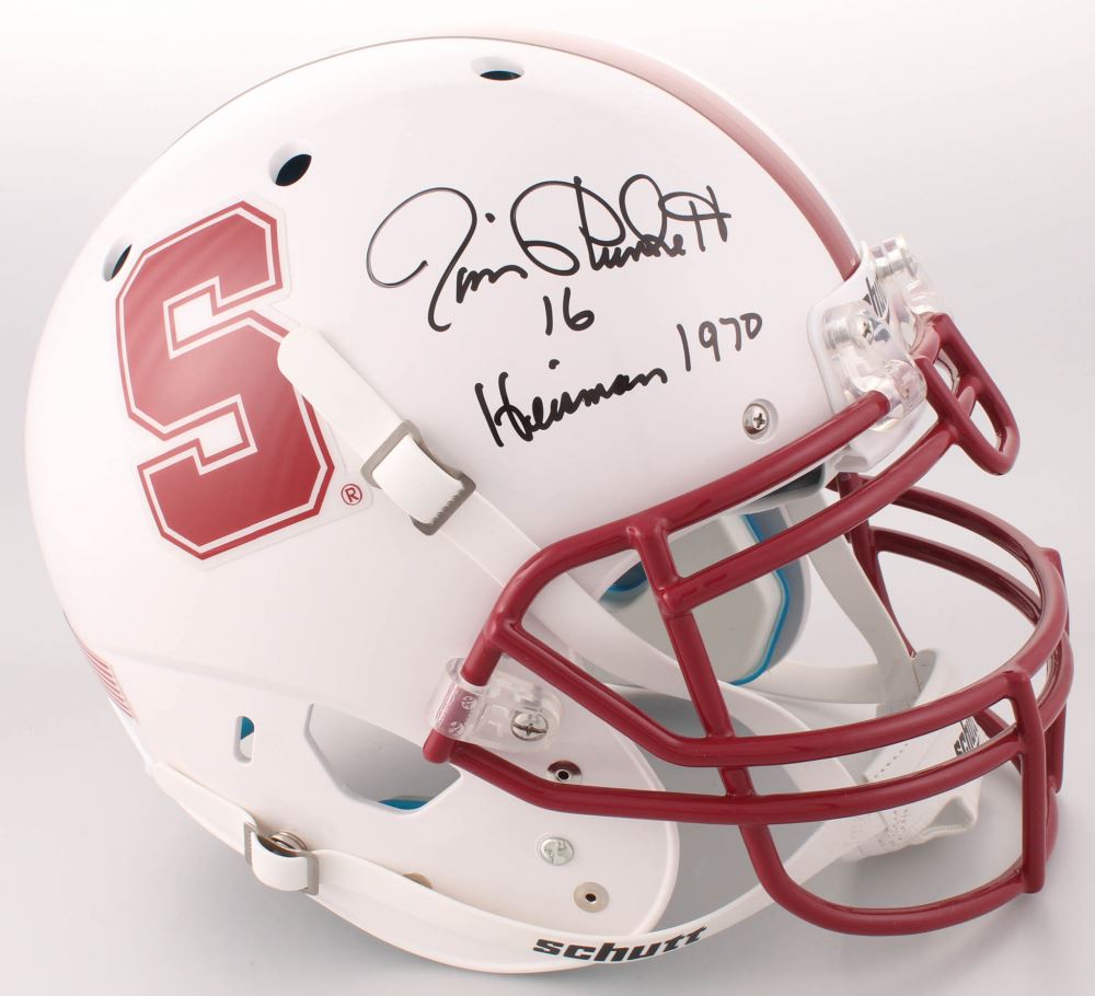 Schutt Stanford Cardinal full-size authentic on-field helmet. Hand-signed and inscribed in black felt-tip pen by Jim Plunkett.