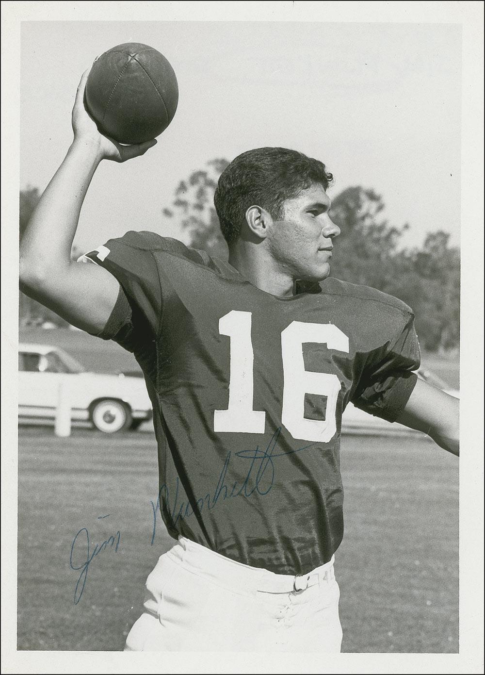 Vintage glossy 5 x 7 photo of Plunkett in his Stanford University uniform, signed in blue ballpoint. Date-stamped October 31, 1968. In fine condition, with a couple of creases and show-through from handwriting and notations on the reverse.