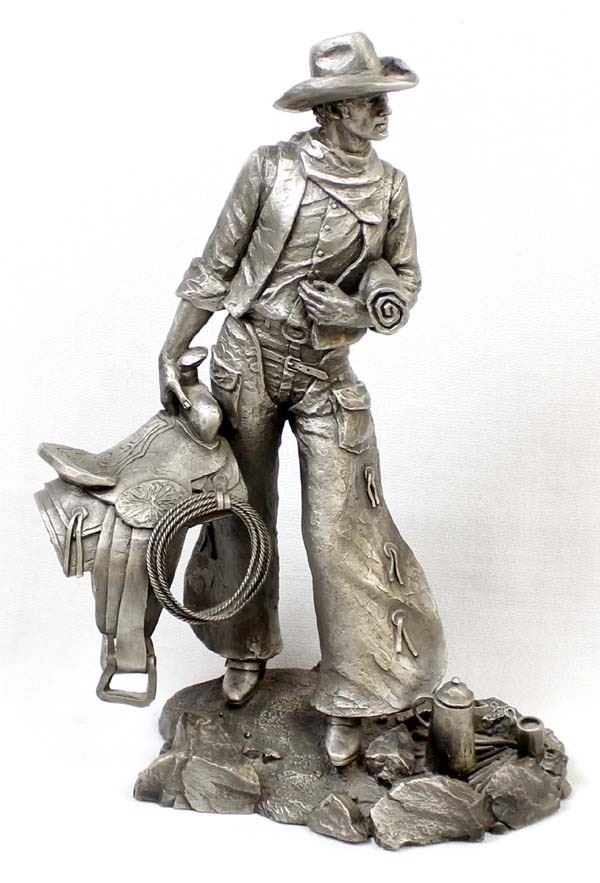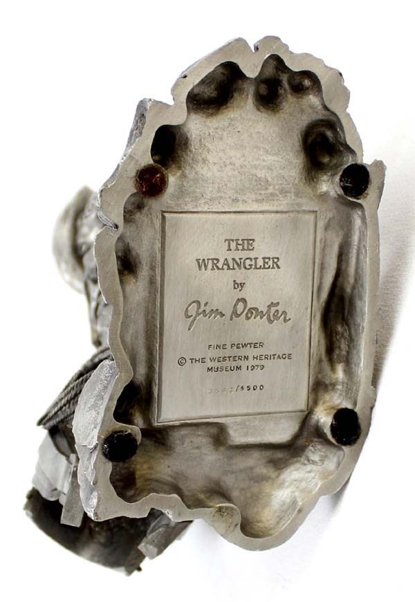 Limited Edition Jim Ponter (1923 - 2007) Fine Pewter Statue ''The Wrangler'', measures 3'' x 10'' x 7'' and is marked on the bottom, the Western Heritage Museum 1979, #3543/4500 FYI: ''Jim, a realist sculptor, studied at the Pennsylvania Academy of Fine Arts and was a veteran of the U.S. Navy. His most ambitious compositions include a larger than life bronze statue of a coal miner. That statue stands in Minersville, PA, near Jim's home town of Pottsville, in tribute to the coalminers of the region.''