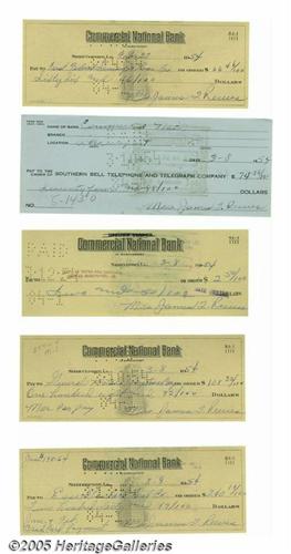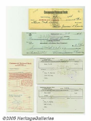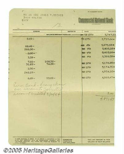<B>Jim Reeves Bank Statement.</B></I> Dated March of 1954, showing a balance of $4,871.47. Also included are six cancelled checks from the account written by Reeves' wife. In excellent condition.