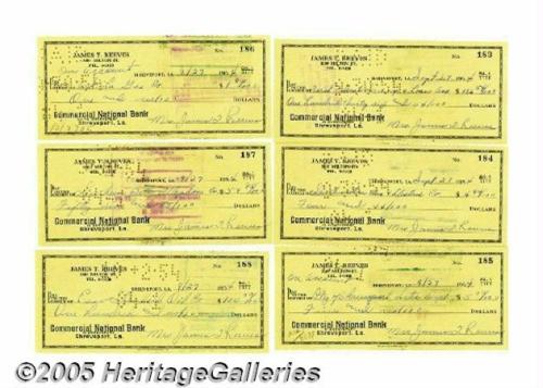 <B>Jim Reeves Personal Checks.</B></I> Six checks written on Reeves' personal account, all dated September 27, 1954, and signed by Reeves' wife. All are in great condition with some fading and the usual cancellation holes.