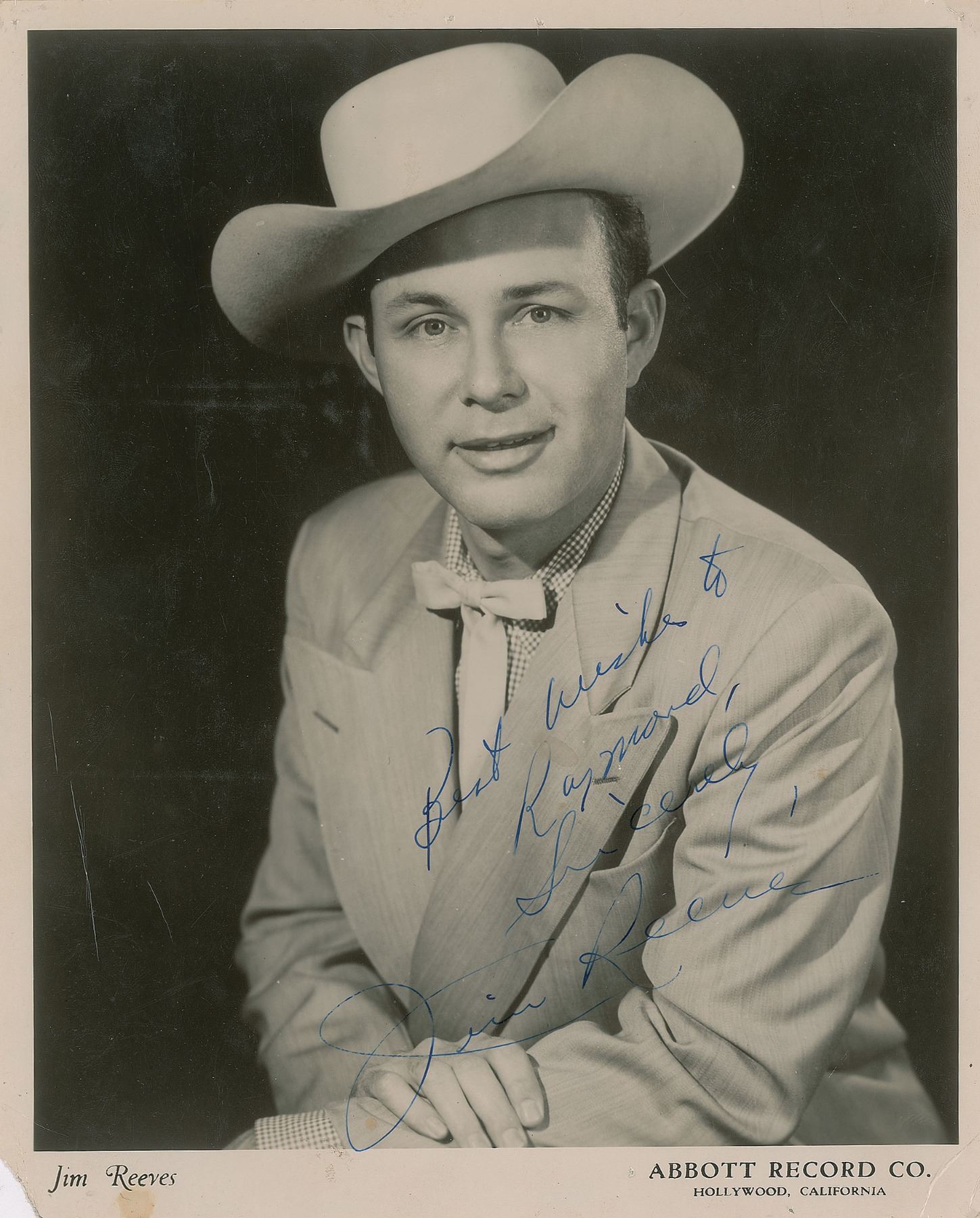 Vintage glossy 8 x 10 publicity photo of Reeves, signed and inscribed in fountain pen, "Best wishes to Raymond, Sincerely, Jim Reeves." Also inscribed and signed on the reverse by musicians Tibby Edwards, Jack Hunt, and Carolyn Bradshaw. In very good condition, with a missing lower left corner tip, scattered creasing, some old mounting residue on the back, and surface impressions from the signatures on the back. Consignor notes that the signature was obtained backstage in 1954 at the Louisiana Hayride.
