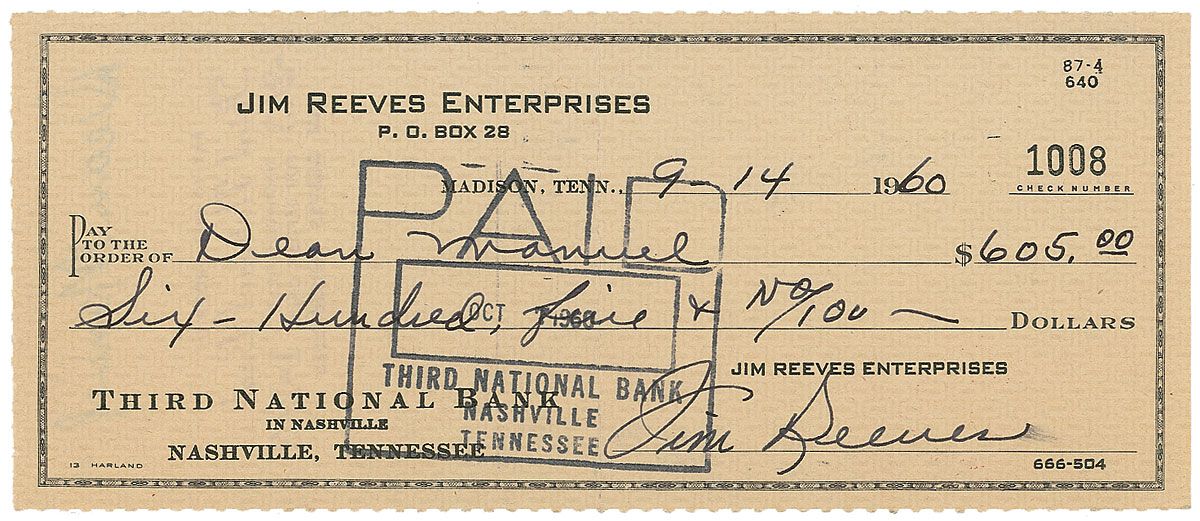 Country-pop star (born 1923) who enjoyed international fame until his death in a plane crash in 1964. Jim Reeves Enterprises business check, 7 x 3, filled out and signed by Reeves, payable to Dean Manuel for $605.00, September 14, 1960. A central vertical fold and a bank stamp over first name of signature, otherwise fine condition.