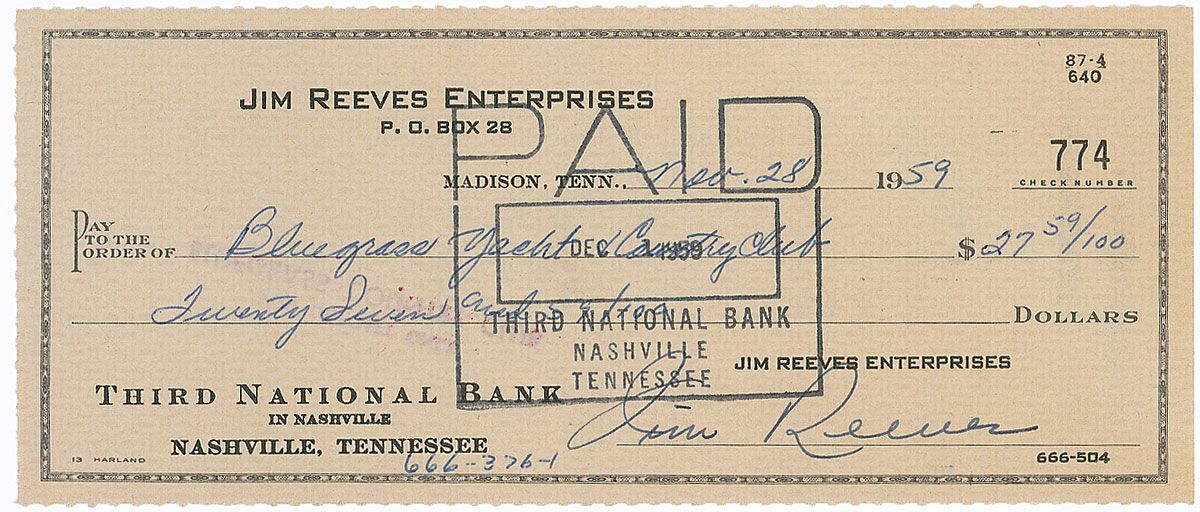 Jim Reeves Enterprises business check, 7.25 x 3, filled out in another hand and signed by Reeves, payable to the Bluegrass Yacht & Country Club for $27.59, November 28, 1959. In fine condition, with expected bank stamps affecting the top of the signature.