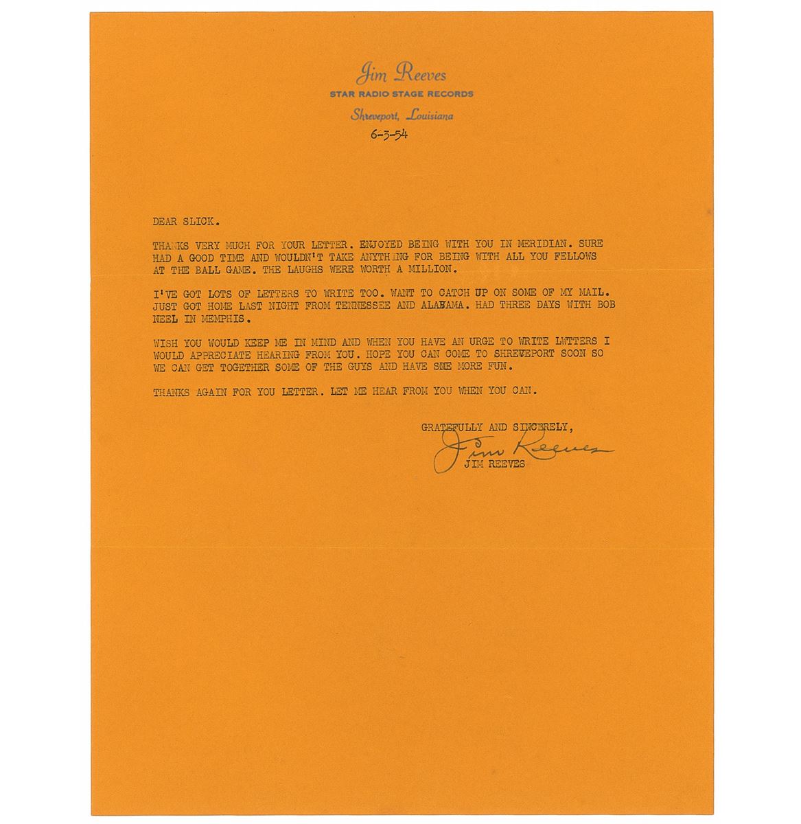 Pop-country star (1923–1964) who enjoyed international fame with his traditional Nashville sound. TLS, one page, 8.5 x 11, personal letterhead, June 3, 1954. Letter to Slick Morris, in part: “Enjoyed being with you in Meridian. Sure had a good time and wouldn’t take anything for being with all you fellows at the ball game. The laughs were worth a million. I’ve got lots of letters to write too. Want to catch up on some of my mail. Just got home last night from Tennessee and Alabama. Had three days with Bob Neel in Memphis.” In fine condition. Accompanied by the original mailing envelope.