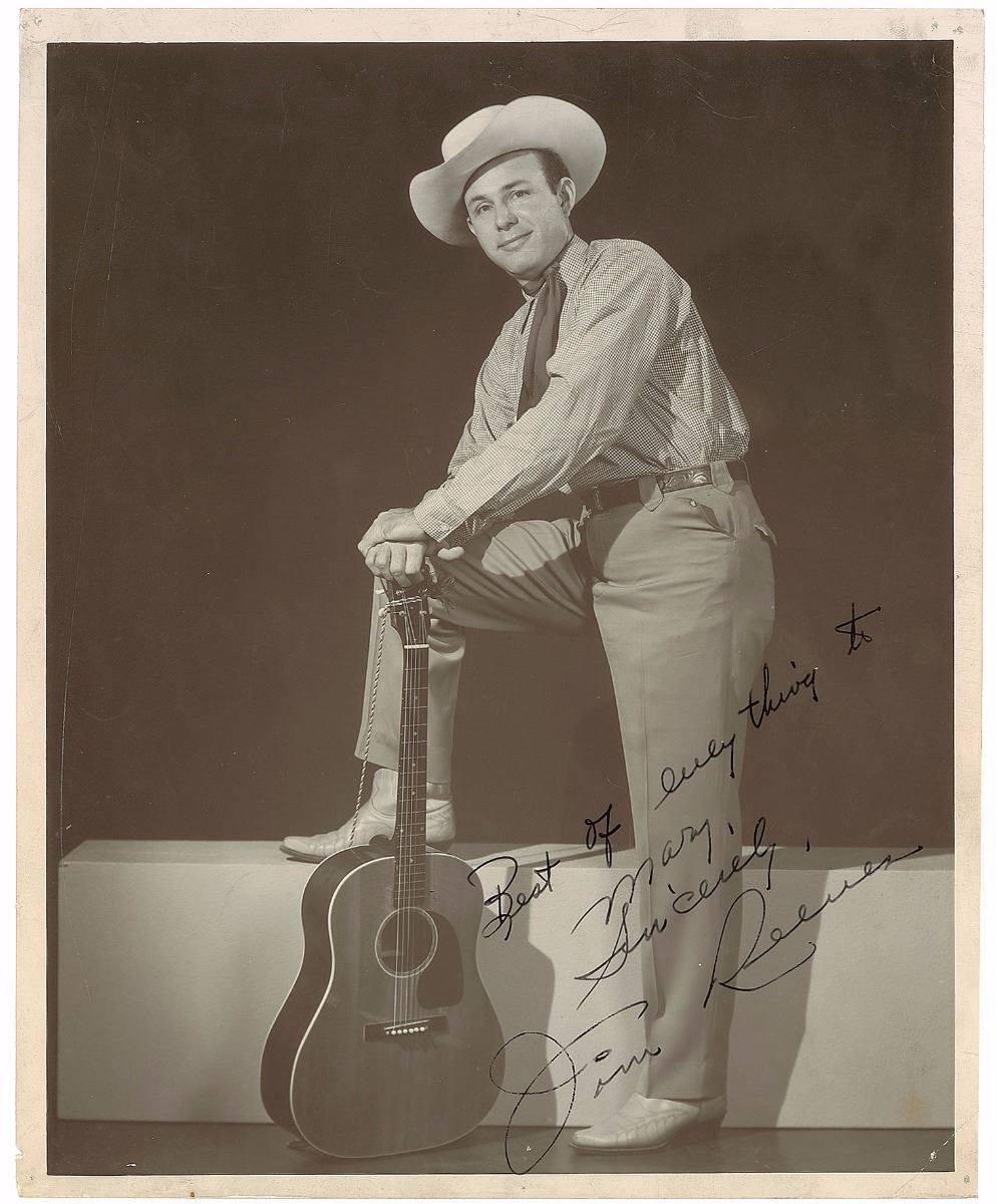 Vintage glossy 8 x 10 full-length photo of Reeves leaning coolly on his guitar, signed and inscribed in fountain pen, “Best of everything to Mary, Sincerely, Jim Reeves.” Tack holes and slight chipping to corners and top and bottom borders, with slight scattered creasing, otherwise fine condition; none of which affect the clear image or bold signature. An exemplary photo of ‘Gentleman Jim,’ one of the foremost practitioners of the Nashville sound.