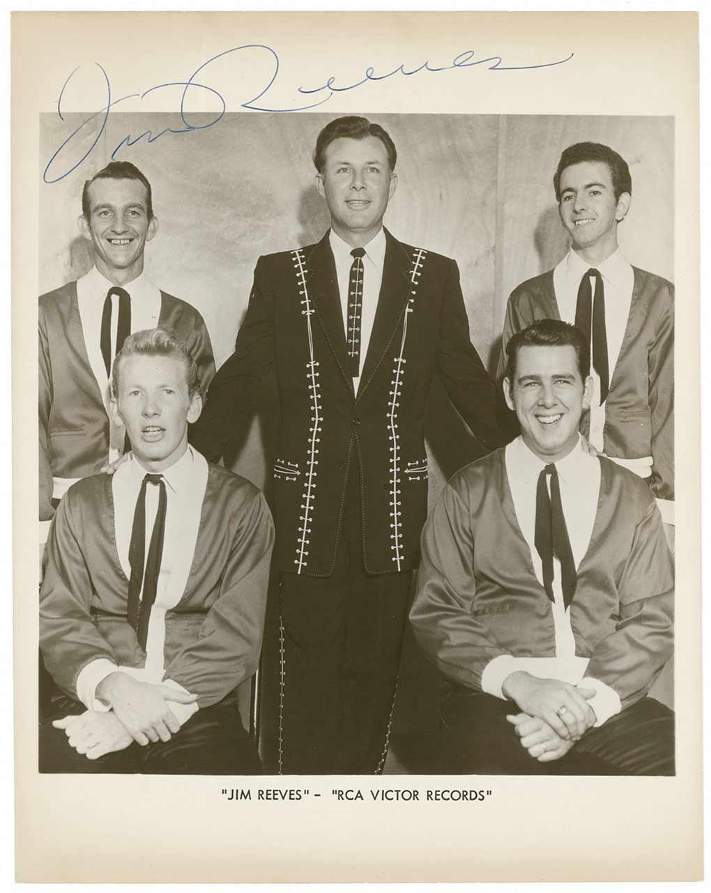 Country-pop star (born 1923) who enjoyed international fame until his death in a plane crash in 1964. Vintage glossy 8 x 10 RCA Victor Records promotional photo, signed in blue ballpoint. Some scattered light creases and surface marks, and light toning to borders, otherwise fine condition.