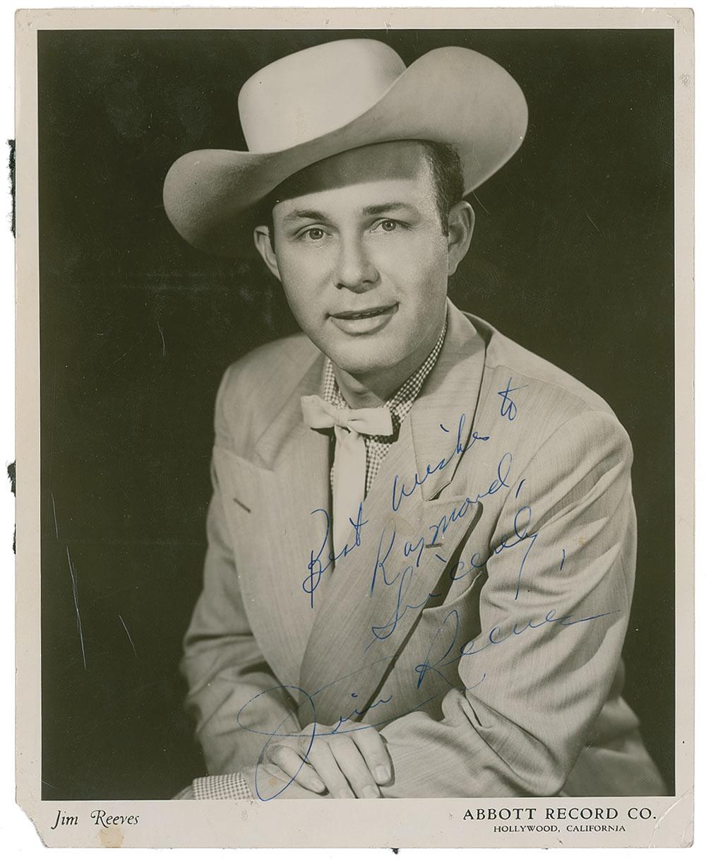 Country-pop star (born 1923) who enjoyed international fame until his death in a plane crash in 1964. Vintage glossy 8 x 10 photo, signed and inscribed in fountain pen “Best wishes to Raymond, Sincerely, Jim Reeves.” Also inscribed and signed on the reverse by musicians Tibby Edwards, Jack Hunt, and Carolyn Bradshaw. In very good condition, with missing lower left corner, scattered creasing, few spots of light staining (one touching the inscription), mounting residue on the back, and impression from signatures on the reverse. The signature was obtained backstage in 1954 at the Louisiana Hayride.
