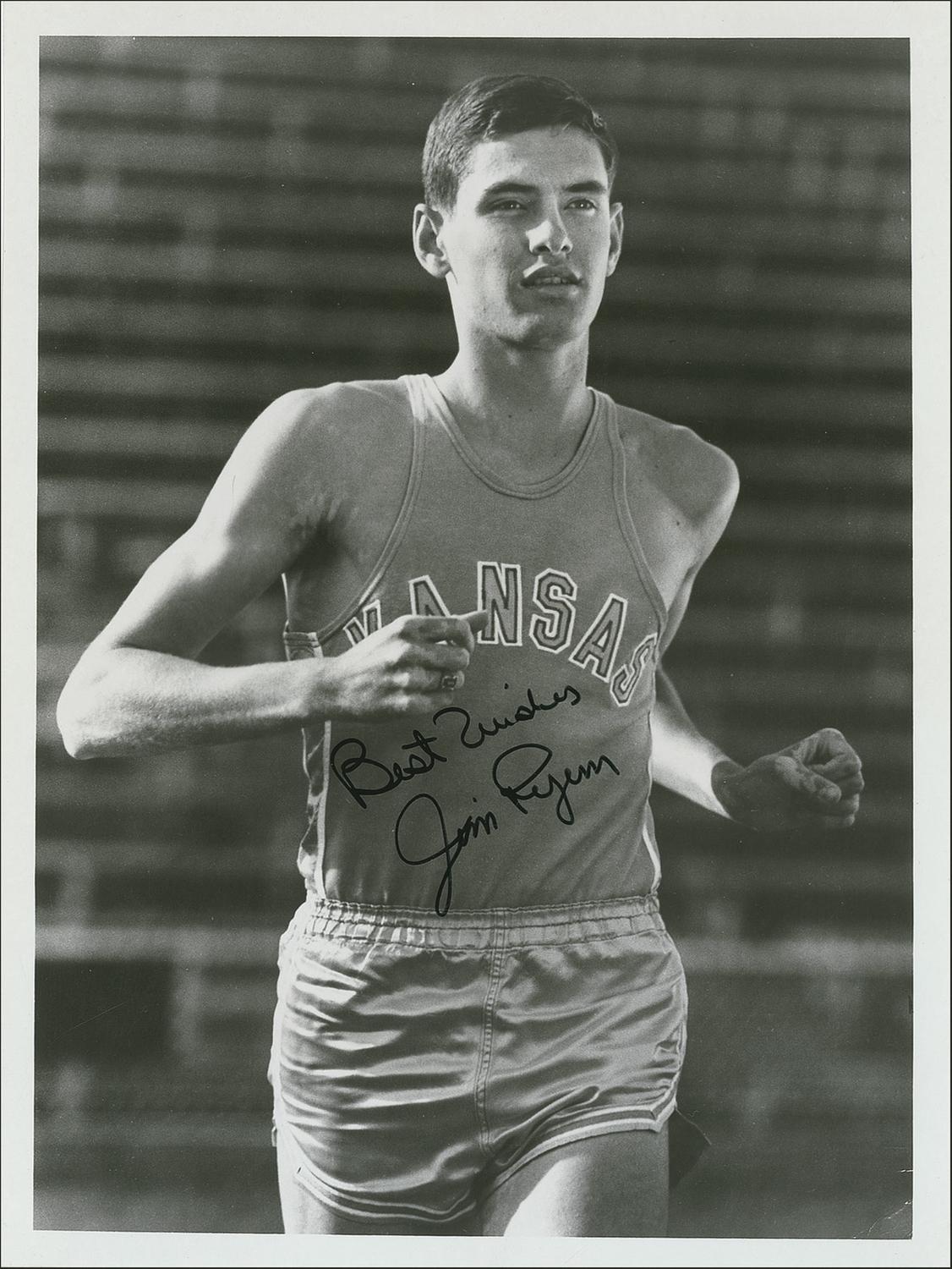 The last American to hold the world record in the mile run. Considered one of the greatest runners of all time, Ryun went on to serve in the House of Representatives from 1996-2007. Vintage glossy 7.5 x 10 photo of Ryun running for Kansas, signed later in black felt tip, “Best wishes, Jim Ryun.” Scattered creasing, primarily to background, otherwise fine condition.
