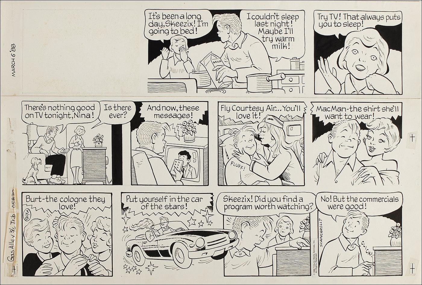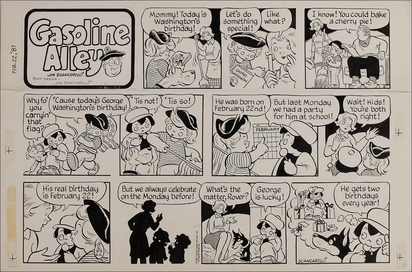 Two original signed hand-inked multi-panel Gasoline Alley comic strips, dated 1987 and 1988 on individual off-white 23.25 x 15.5 pieces of artist’s cardstock. The earlier example is additionally signed in black ink “Buono Fotuna—Jim Scancarelli.” In overall fine condition with old adhesive at the edges, strips of reinforcement tape on the reverse of each, light show-through from an adhesive label, and one example missing the name panel.